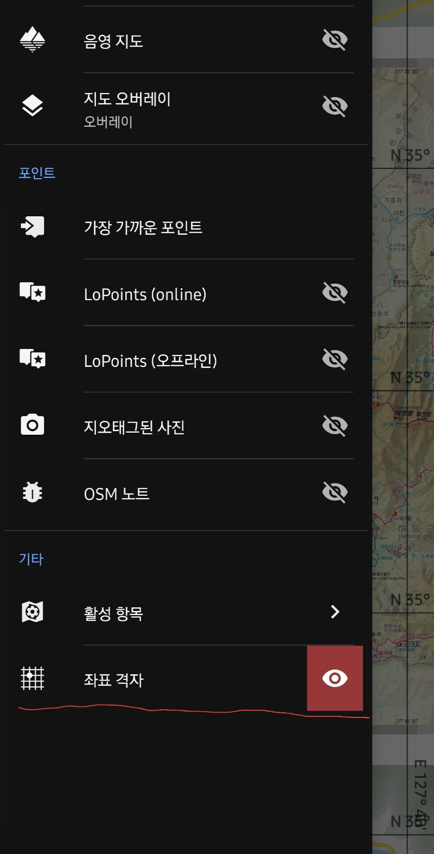 지도 항목에서 보시면 보정된 지도가 보이는데요 여기에 들어가서 눈깔(활성화) 마크를 해제시키면 됩니다 이곳에서 지도를 끄고 키시면 됩니다