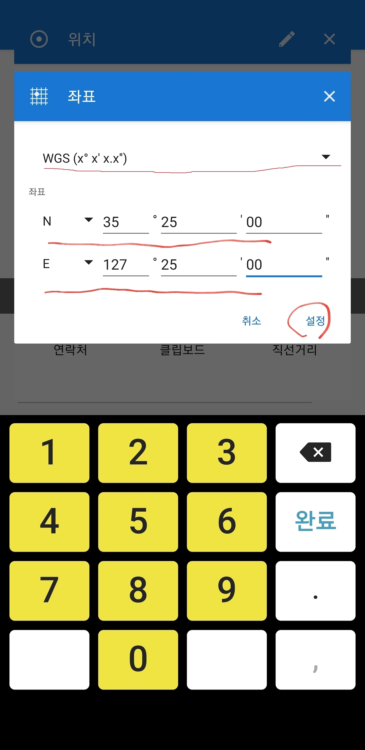 동그라미 친 부분을 따라가시면 좌표를 입력하는 창이 뜹니다 지도 좌표에 있는 형식에 맞게 상단 밑줄 친 부분에서 선택하시고 아까 알았던 좌표를 입력합니다