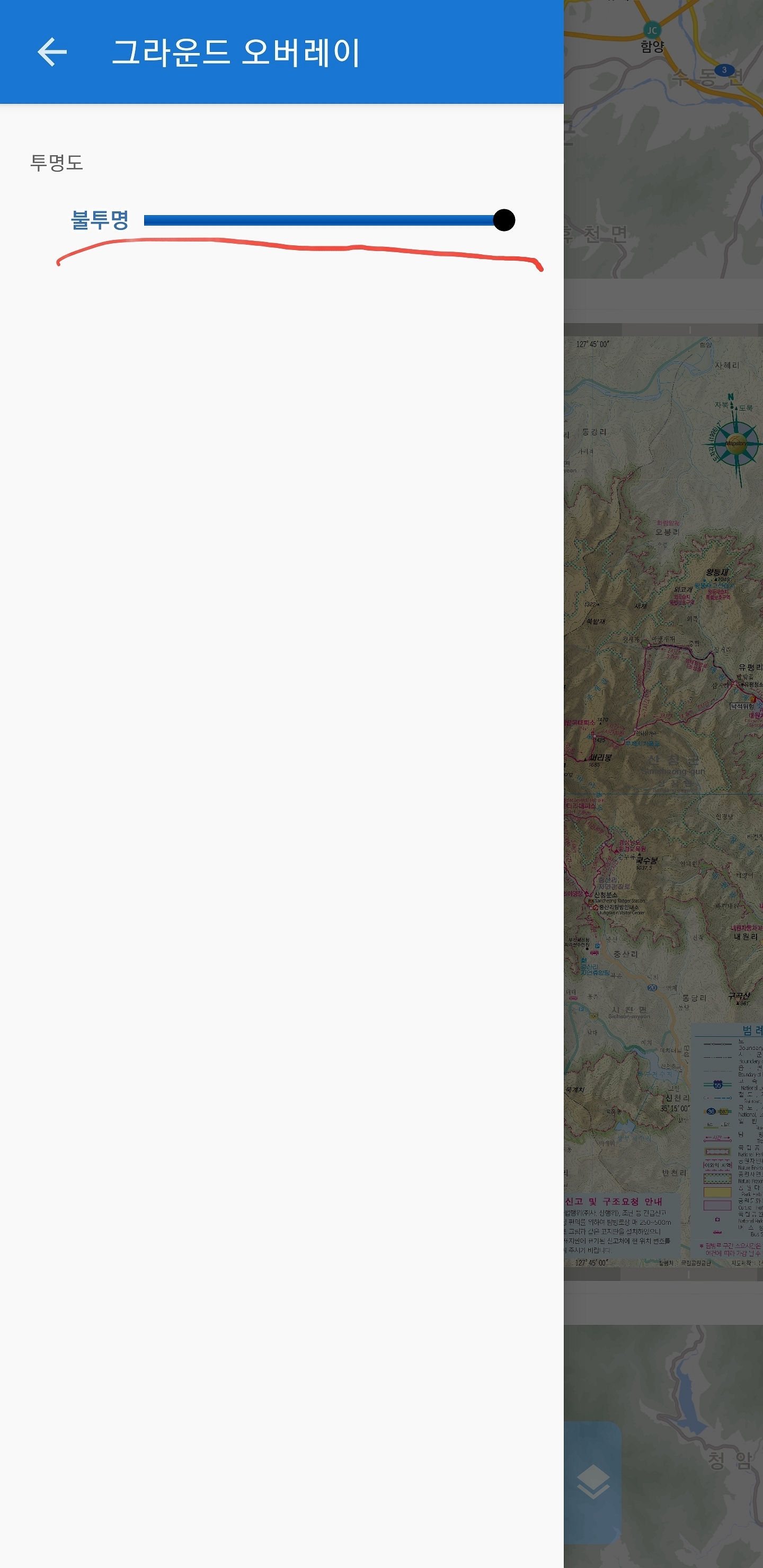 이것도 오버레이 지도이기 때문에 불투명도를 조절할 수 있습니다 하는 방법은 “맵-스트린 내용” 이나 ”지도 도구”에서 활성 항목에서 조절할 수 있습니다