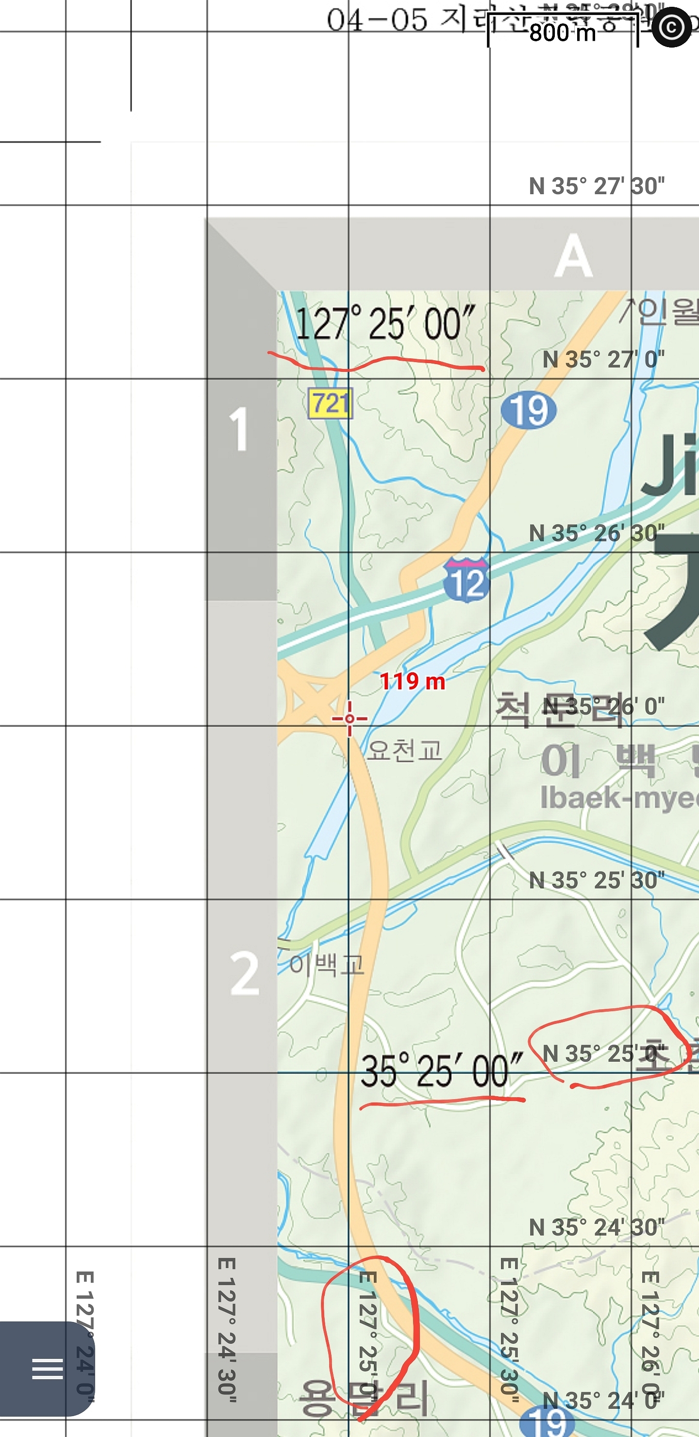 누르면 사진처럼 보정 하는 그림이 뜹니다 좌표로 보정하기로 했기 때문에 가운데 십자 커서를 동그라미 여러 번 친부분에 맞춥니다(35.25,00 , 127.25,00) 맞추실 때 오른쪽에 보면 확대 축소 마크가 있는데요 될 수 있으면 확대를 해서 십자 마크를 맞추세요