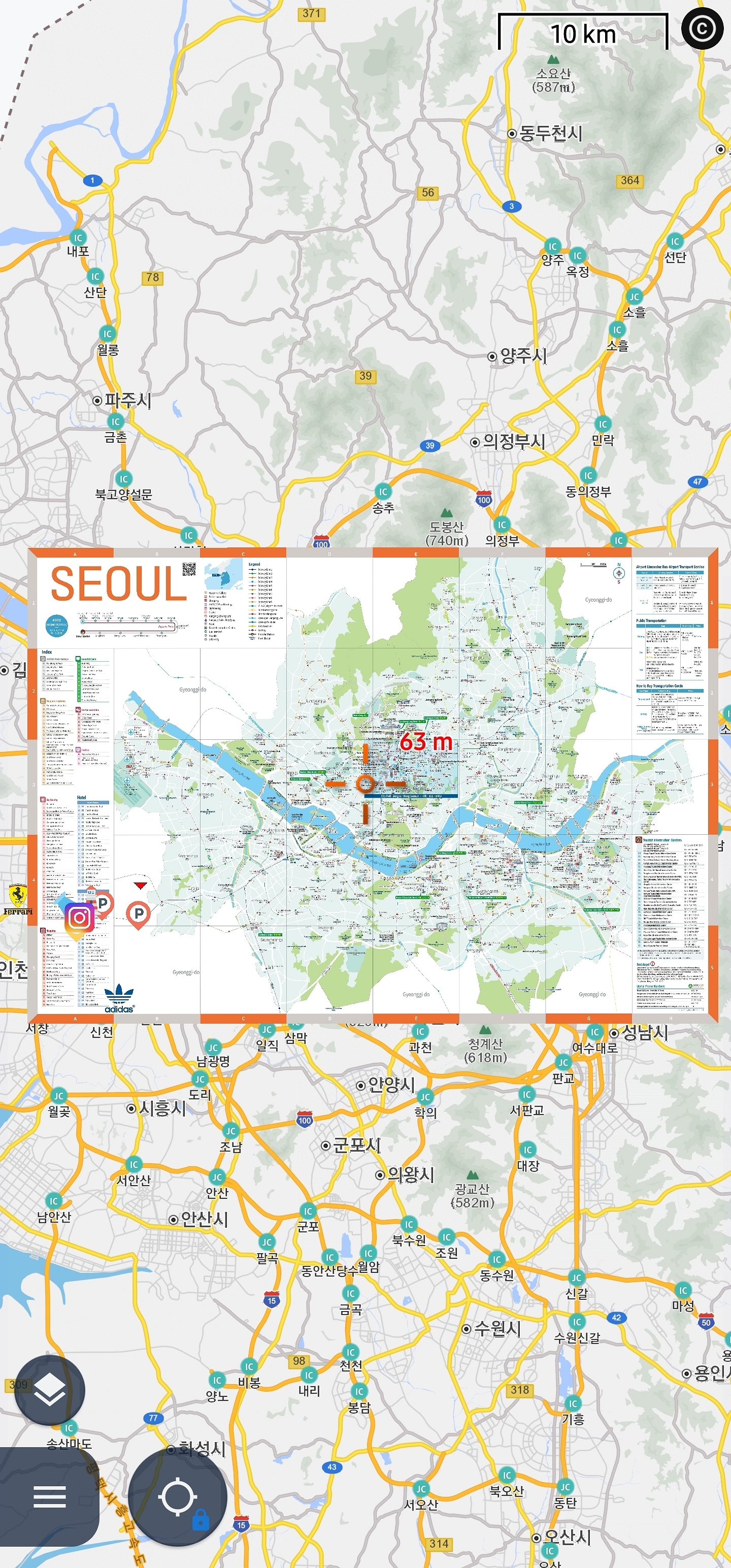 샘플 지도에서 보시면 서울 관광 지도가 있는데요 이 지도 같은 경우 좌표가 없습니다 이런 지도는 사진처럼 역이나 도로를 기준으로 4 귀퉁이에 포인트를 만들고 보정 하시면 됩니다