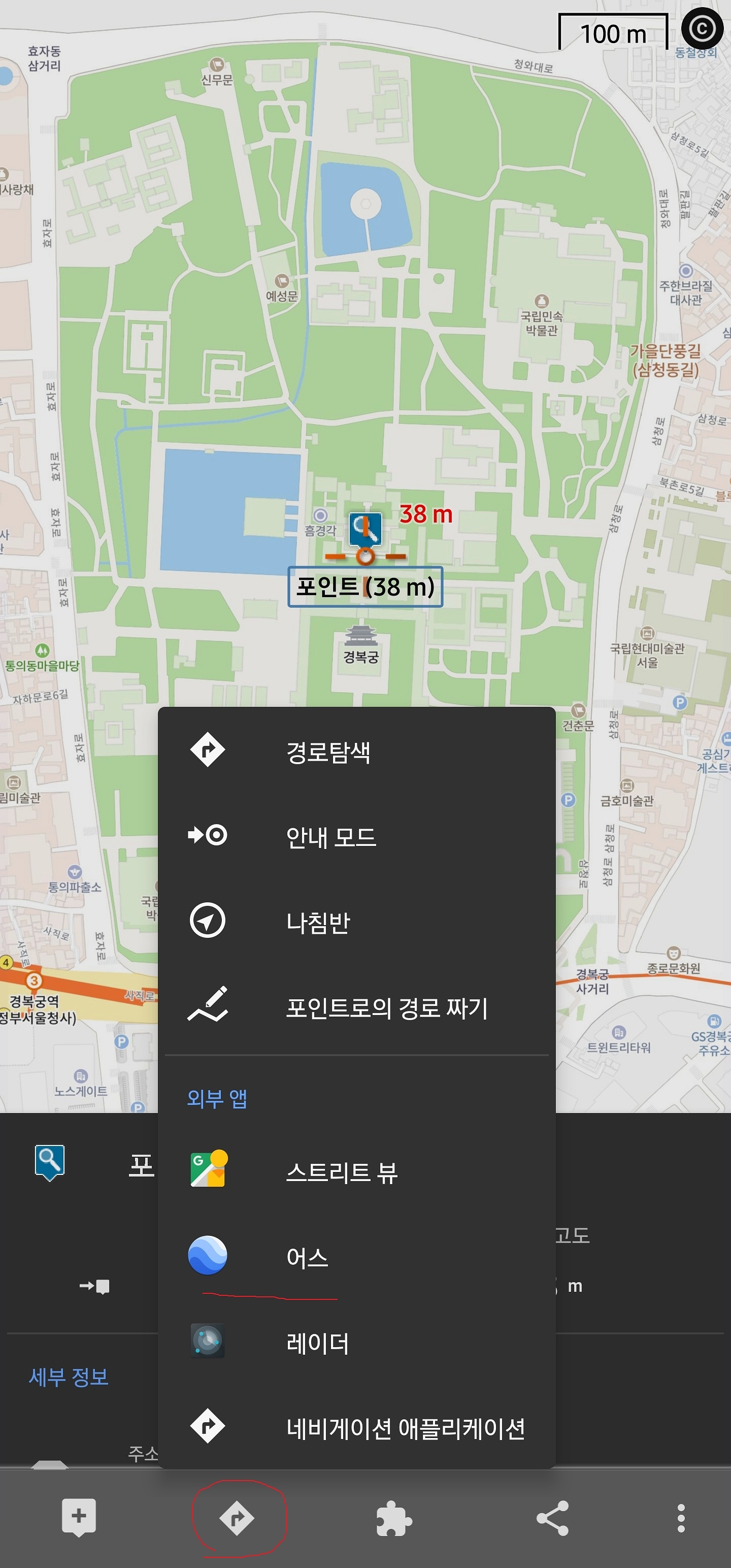 로커스맵에서 사용은 내가 알고 싶은 장소를 손가락으로 누르면 왼쪽 캡처 사진처럼 화면이 나옵니다 거기서 아래 내비게이션 마크를 누르면 방금 활성화된 구글 어스가 나옵니다 여기서 구글 어스를 누르면 오른쪽 사진처럼 바로 구글어스로 연동이 됩니다 ㅎㅎ