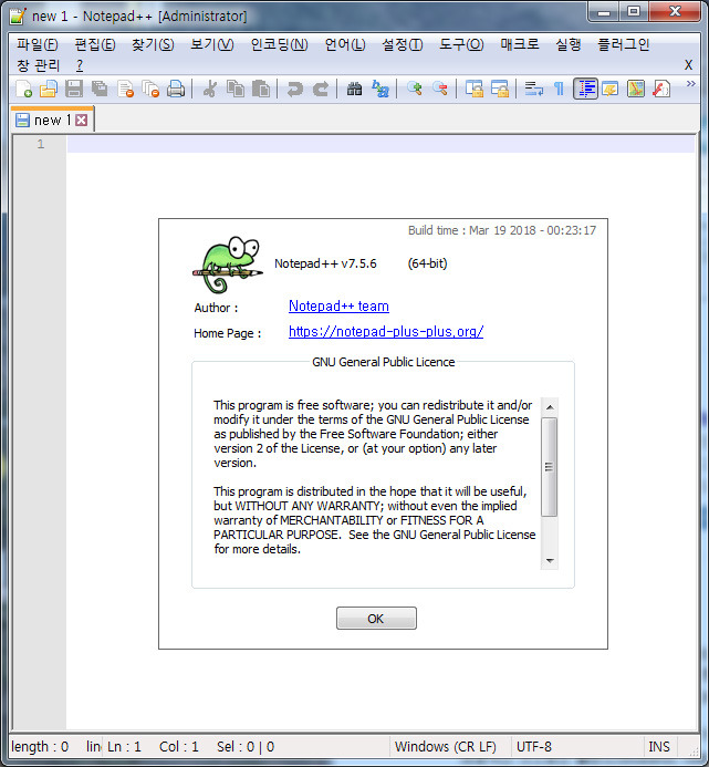 Notepad++의 정보입니다. 현재 v7.5.6 이네요~