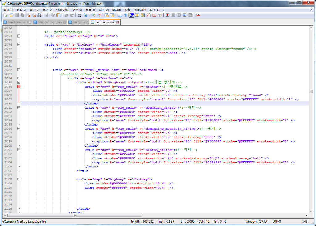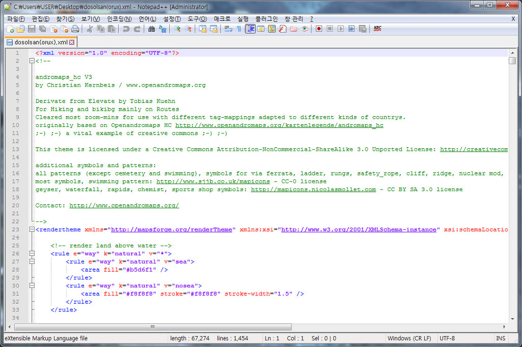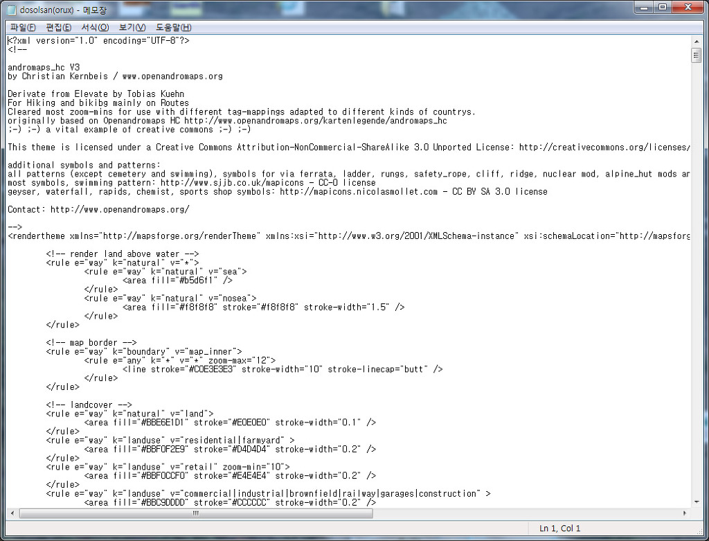 저도 사실 XML파일의 명령어나 구조를 제대로 알지도 못하지만 우리카페에서 쓰는 등산로 파일은 몇가지 요소만 사용하기 때문에 그것이 어딘지만 알면 간단한 색상변경이나 굵기변경은 잠깐만 배우면 가능하기에 기왕이면 자기마음에 맞는 테마를 수정해서 쓰시라고 이 강좌를 만듭니다.