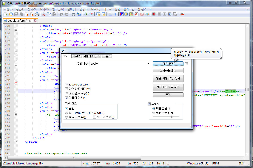 Ctrl+F 를 누르거나 편집 메뉴에서 찾기를 누르면 팝업창이 뜨고 찾을내용에 등산로 를 쳐넣고 다음찾기를 누릅니다.