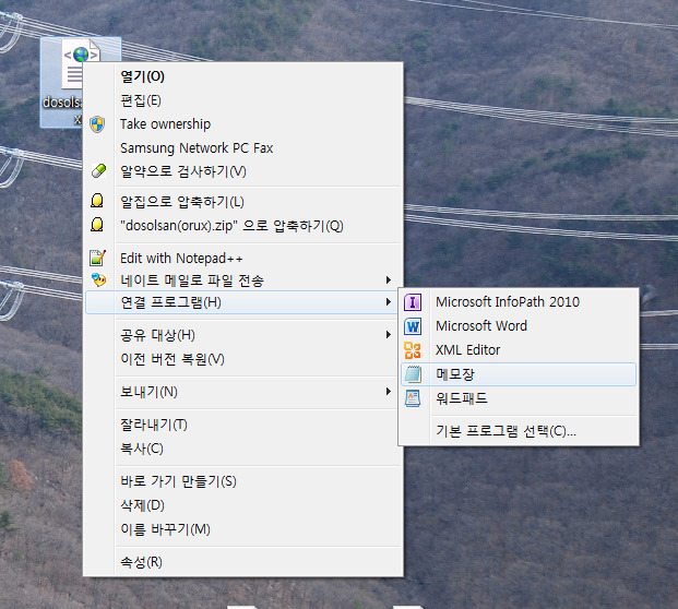 바탕화면에 복사된 dosolsan(orux).xml 파일에 마우스를 대고 우측단추를 클릭하면