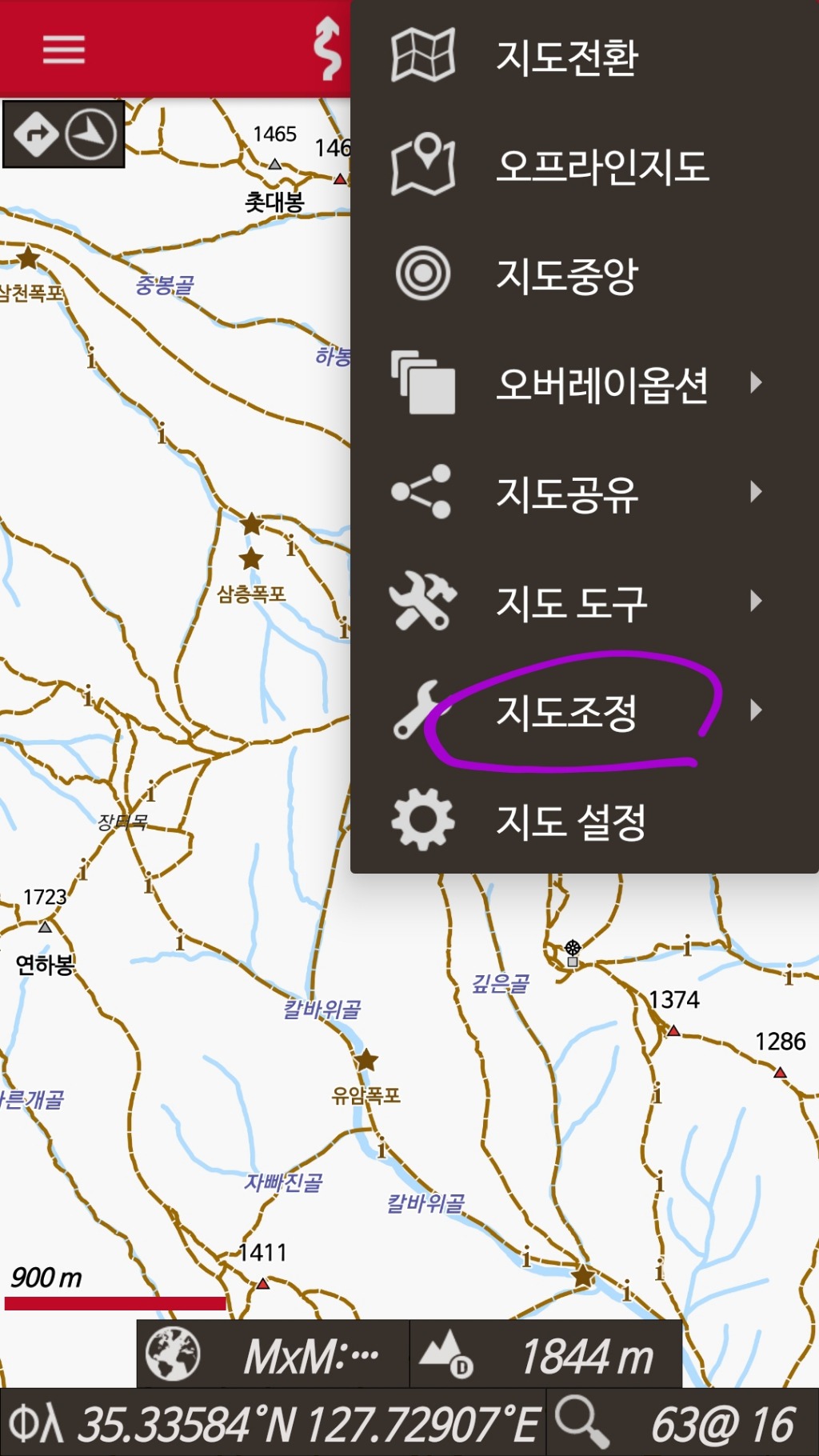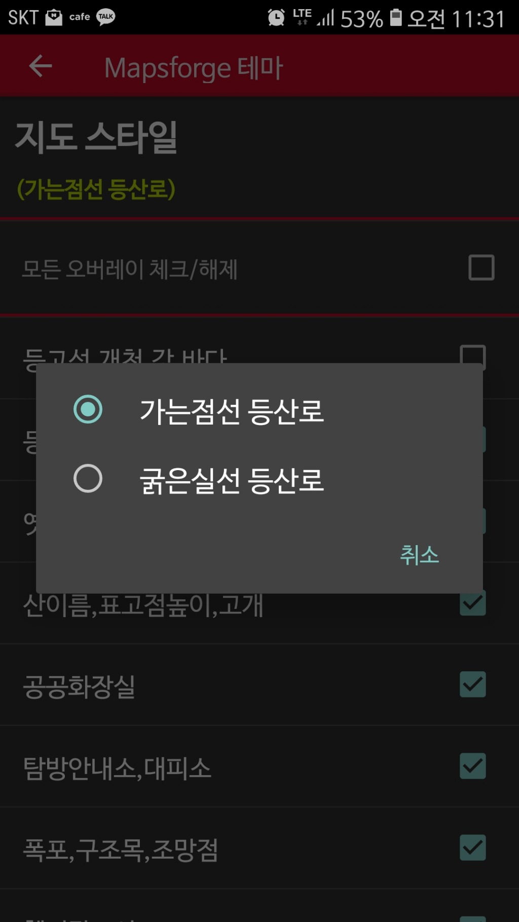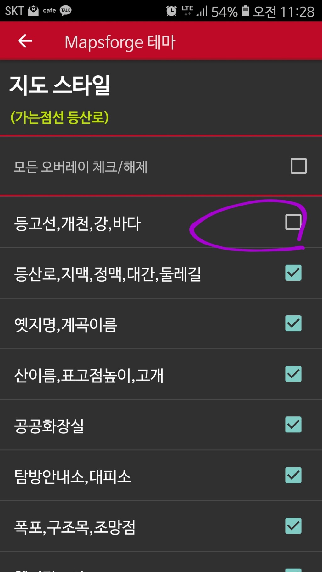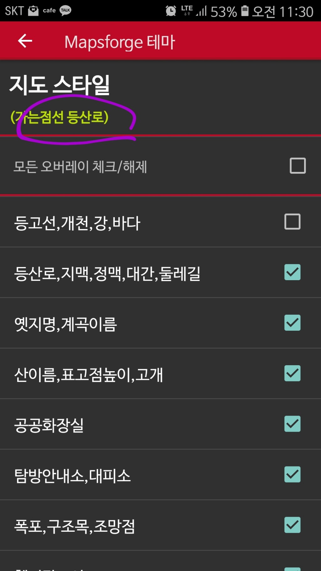 갑자기 등산로지도만 화면에 나온다면 이것 때문입니다.