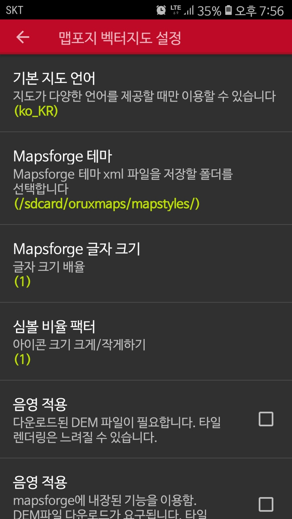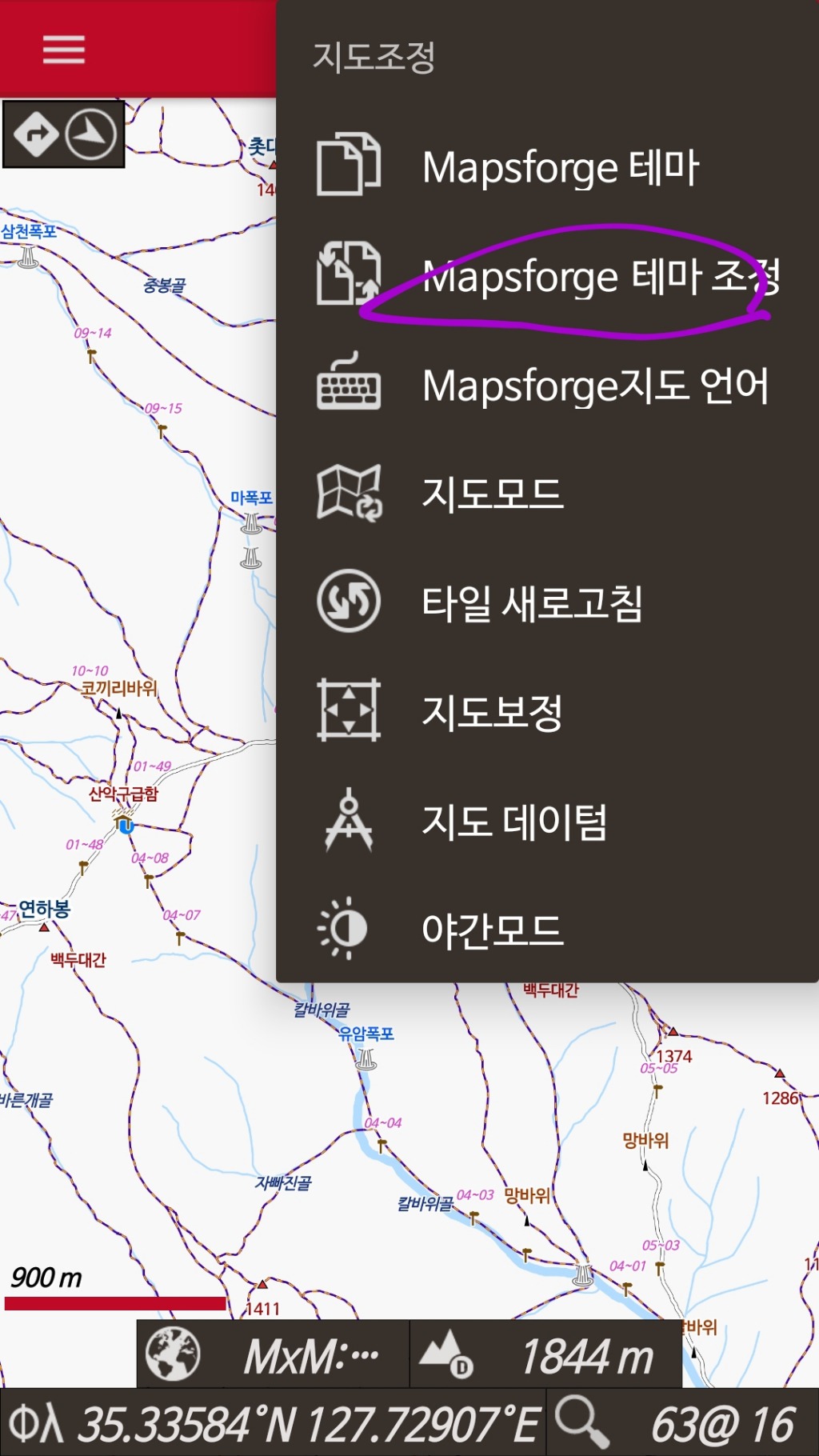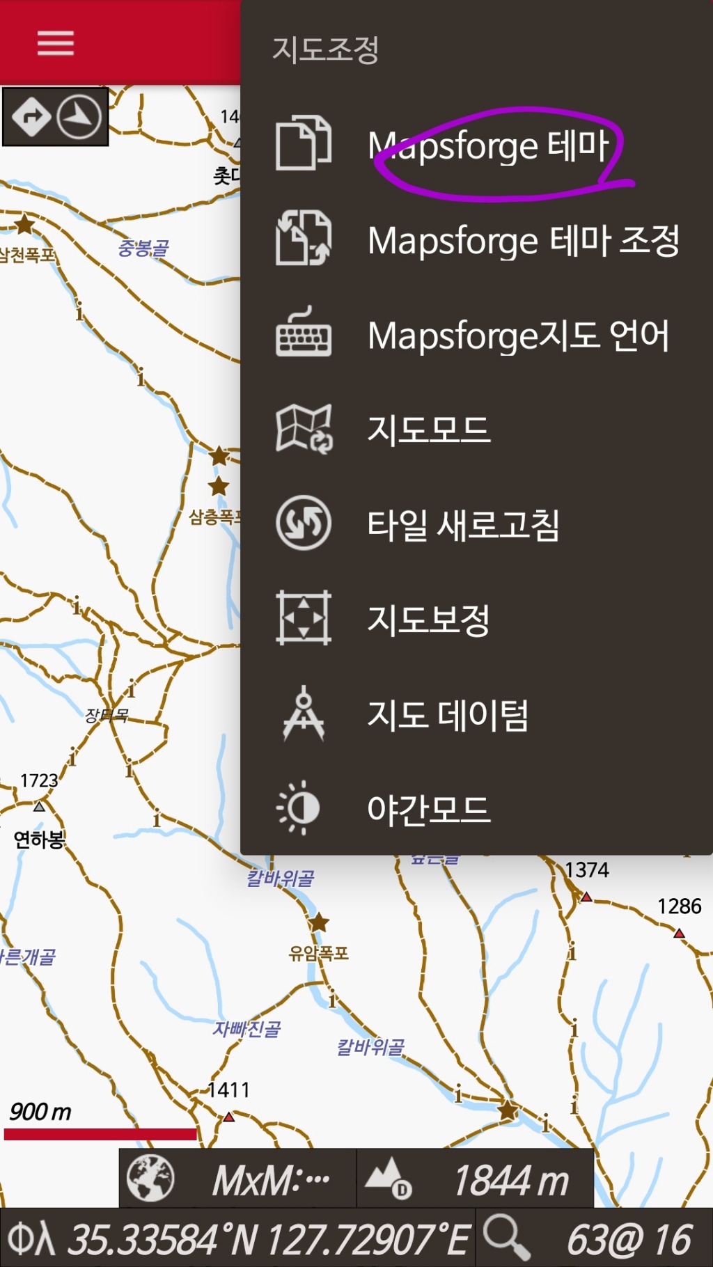(아 여기서 mapforge테마 메뉴가 안보인다는 분들은 벡터지도를 안불러들인 상태일겁니다.