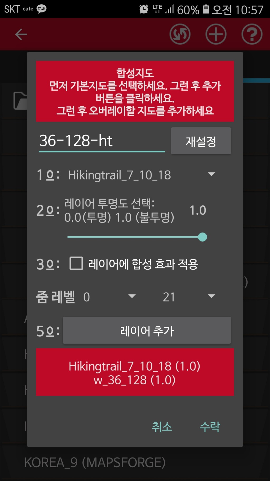 아까 합성효과에 체크를 하지않아서 바닥지도가 안보이고 등산로지도만 보이는 상태입니다.