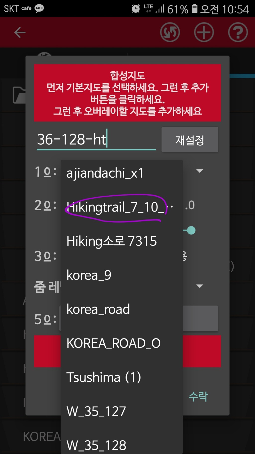 그런다음 다시 1번 부분을 눌러서 위에 얹을 등산로지도인 Hikingtrails_7_10_18.map을 선택합니다.