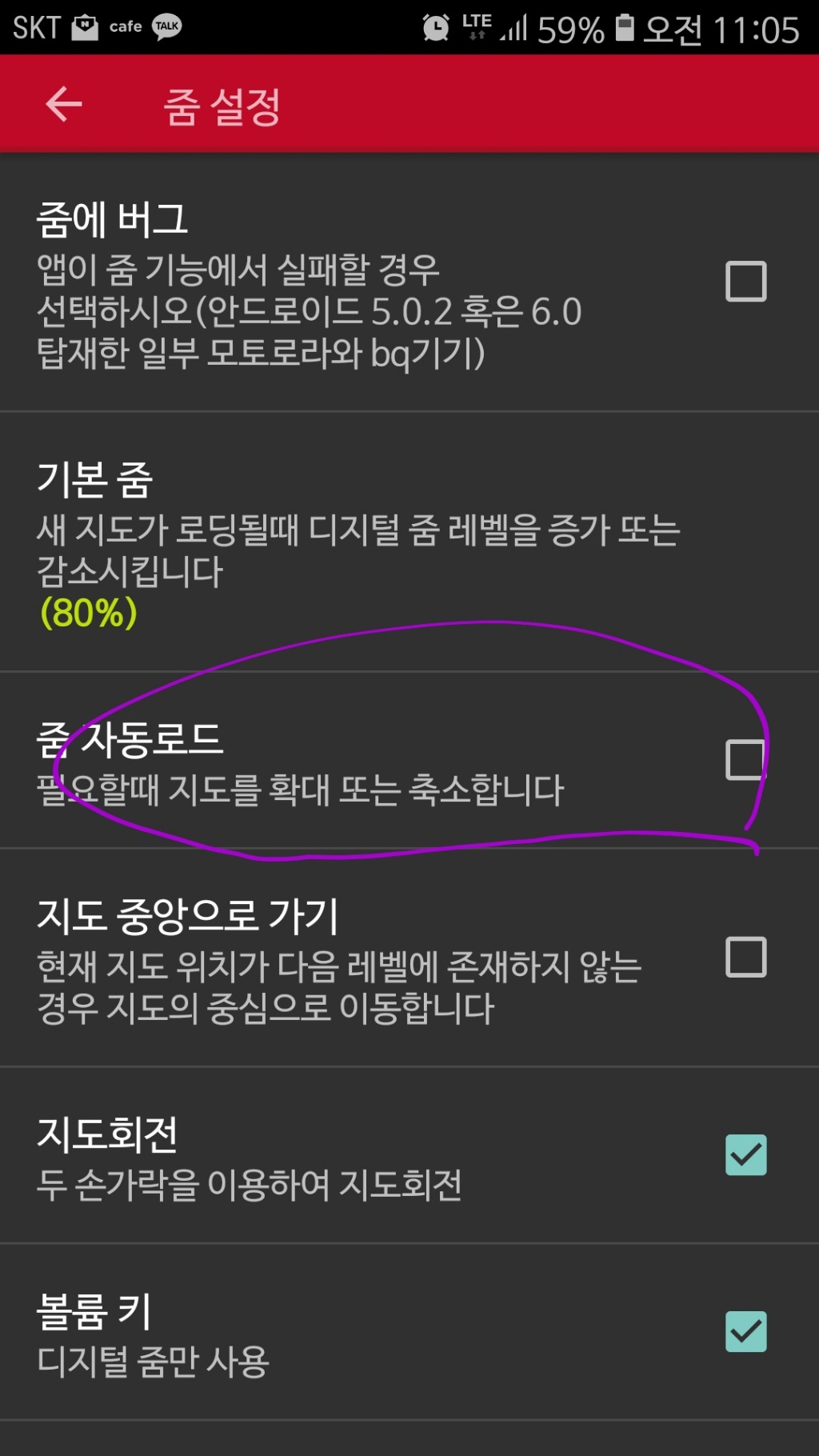 그리고 지도설정에서 줌설정 줌자동로드는 꺼두셔야 축소,확대시 지도가 바뀌지 않습니다.