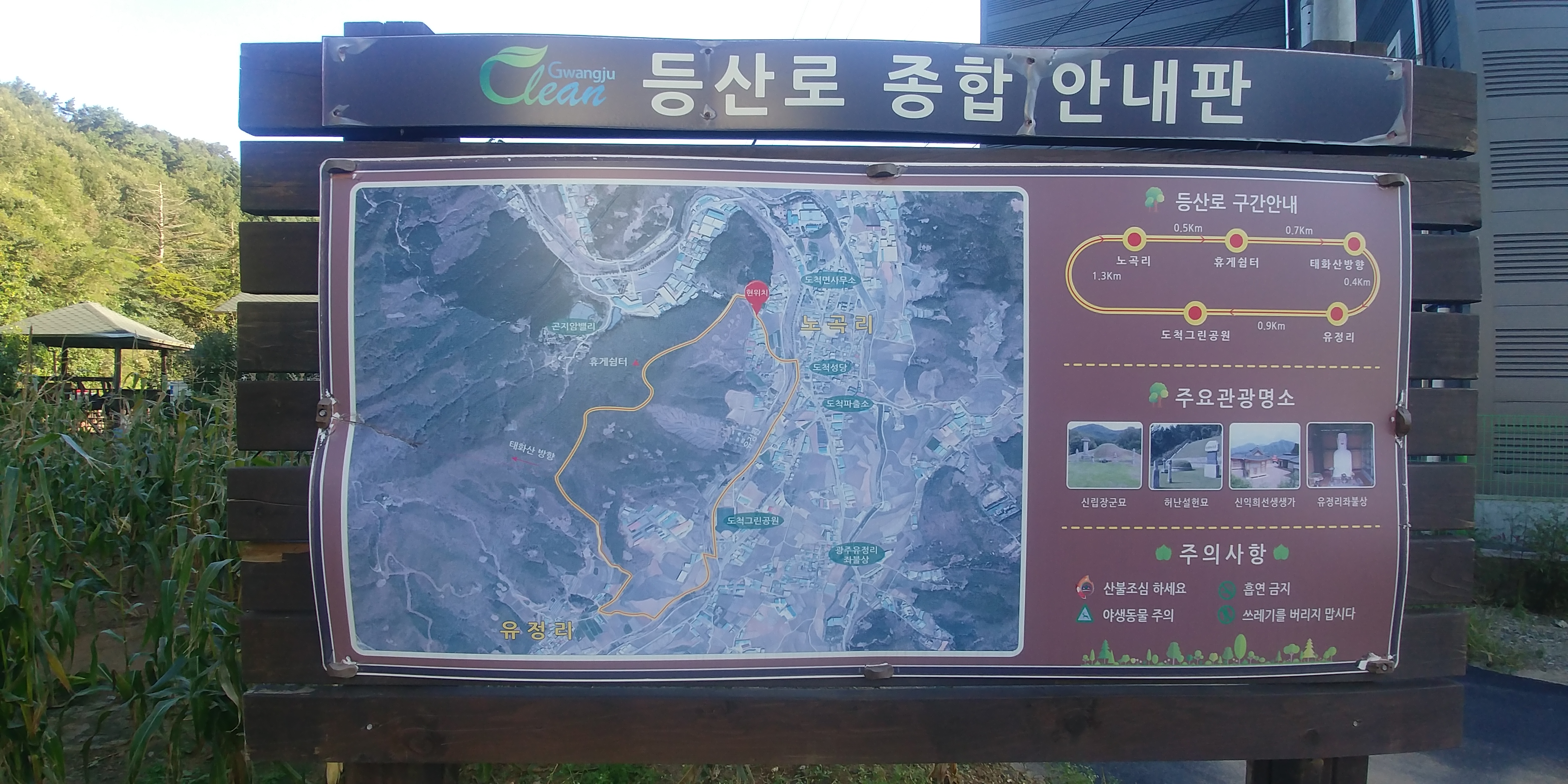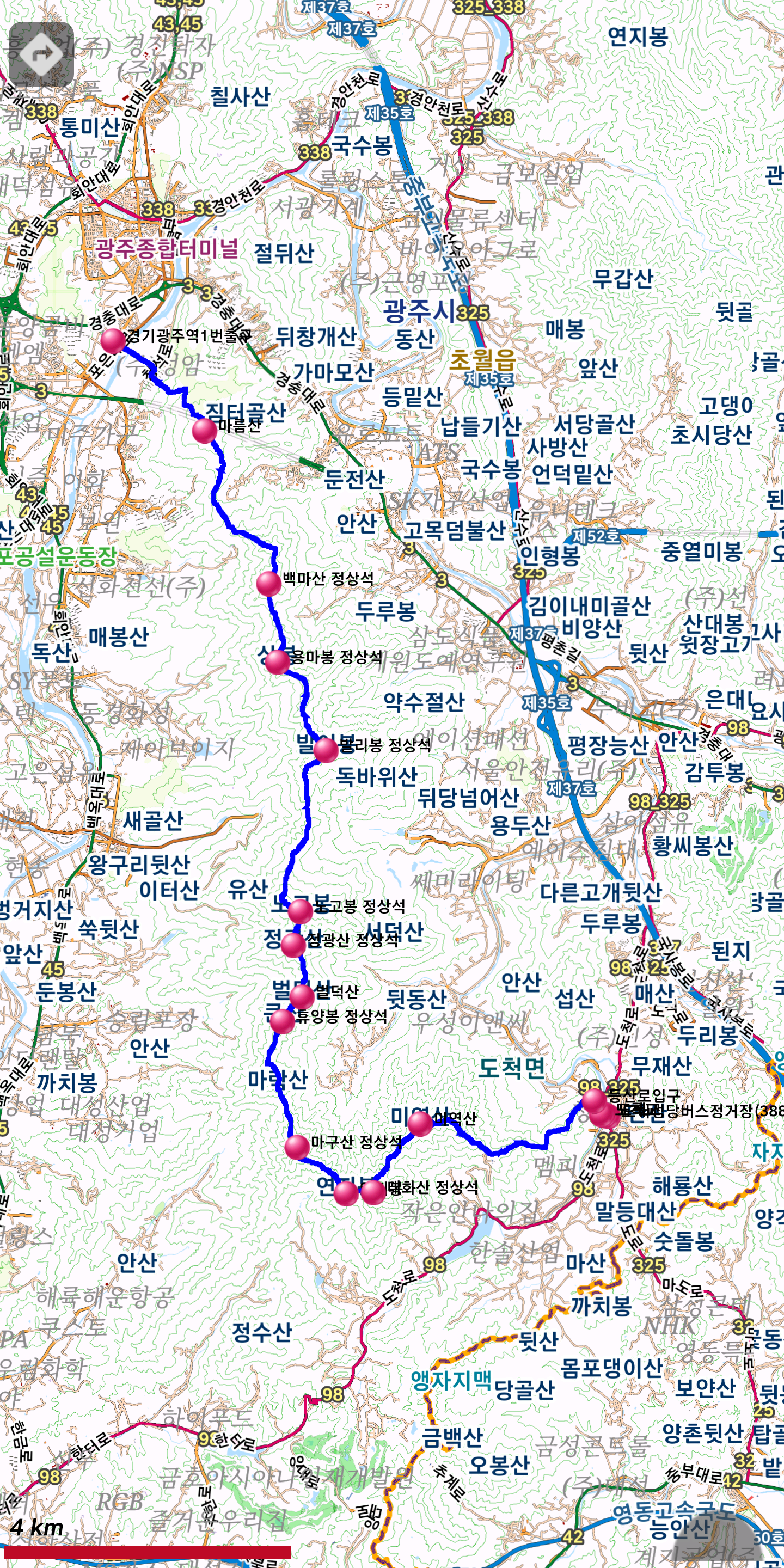 3. 산행코스 : 도척성당버스정거장~도척교~미역산~태화산~휴양봉~정광산~백마산~마름산~경기광주역