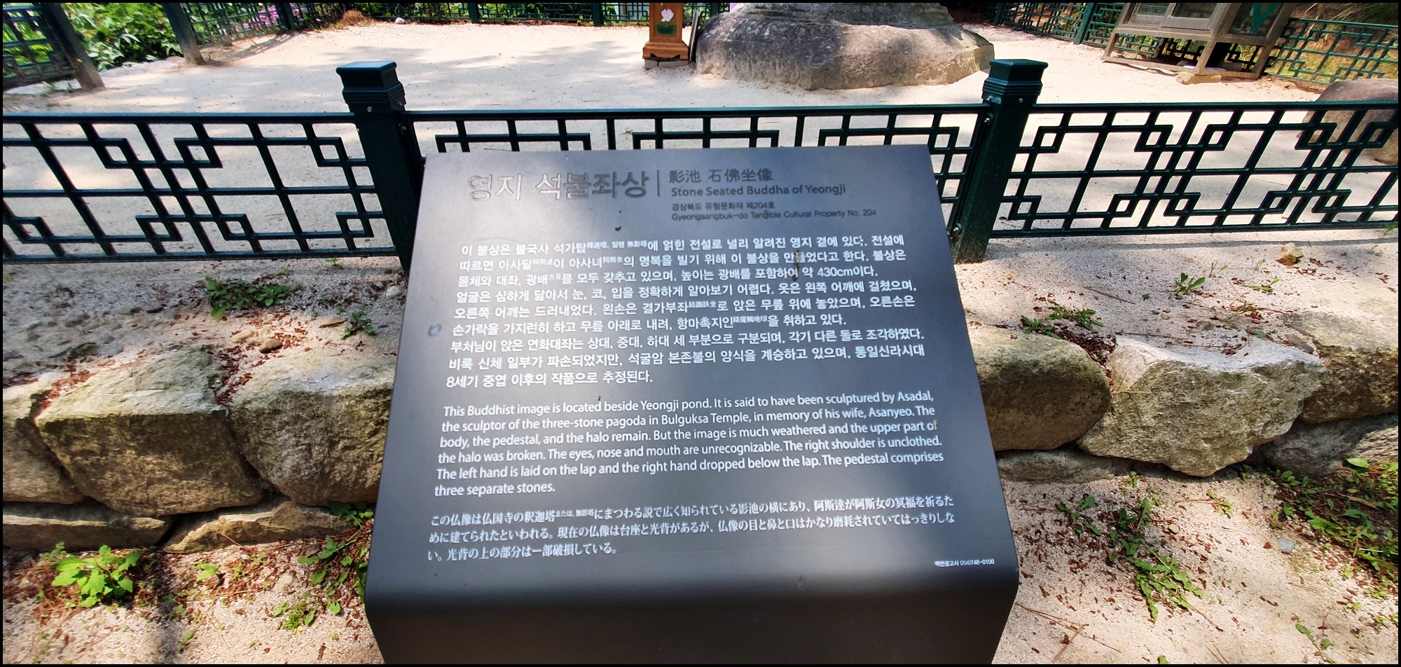 불국사 역에서 울산 쪽으로 2km쯤 가면 영지가 있고, 못 옆에는 아사달이 아내의 모습을 새겼다는 이지러진 석불좌상이 하나 남아 있다. 여러가지 변화된 설화들이 구전 되어 오는데, 불국사고금창기(佛國寺古今創記)에는 "아사달이 석불 조각을 마치고, 고향으로 발길을 돌렸으나 그 뒷일은 아무도 모른다"고 기록되어 있다.