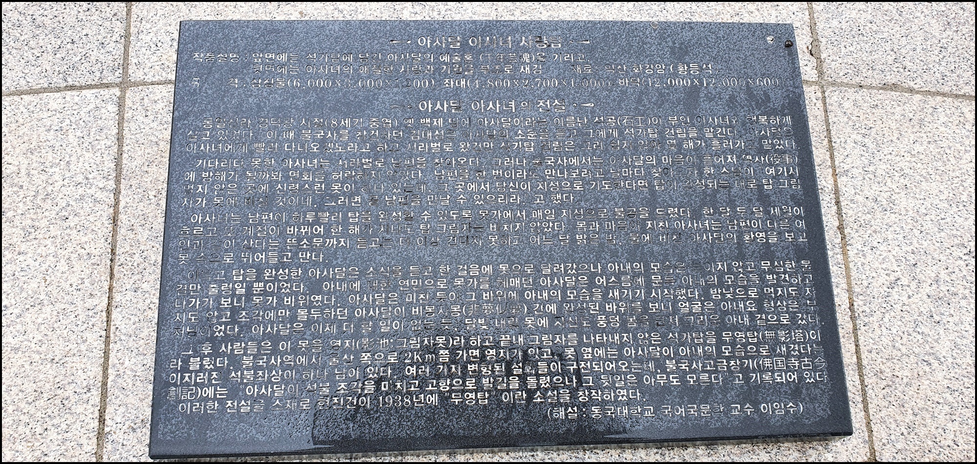 그 후 사람들은 이못을 영지(影池그림자못)라하고 끝내 그림자를 나타내지 않은 석가탑을 무영탑(無影塔)이라 불렀다.