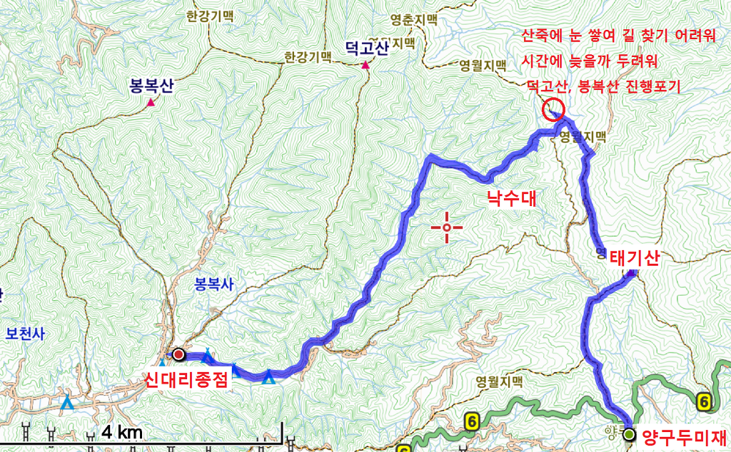 눈덮힌 조릿대숲으로 길을 찾기 어려워 덕고산 봉복산 산행을 포기하고