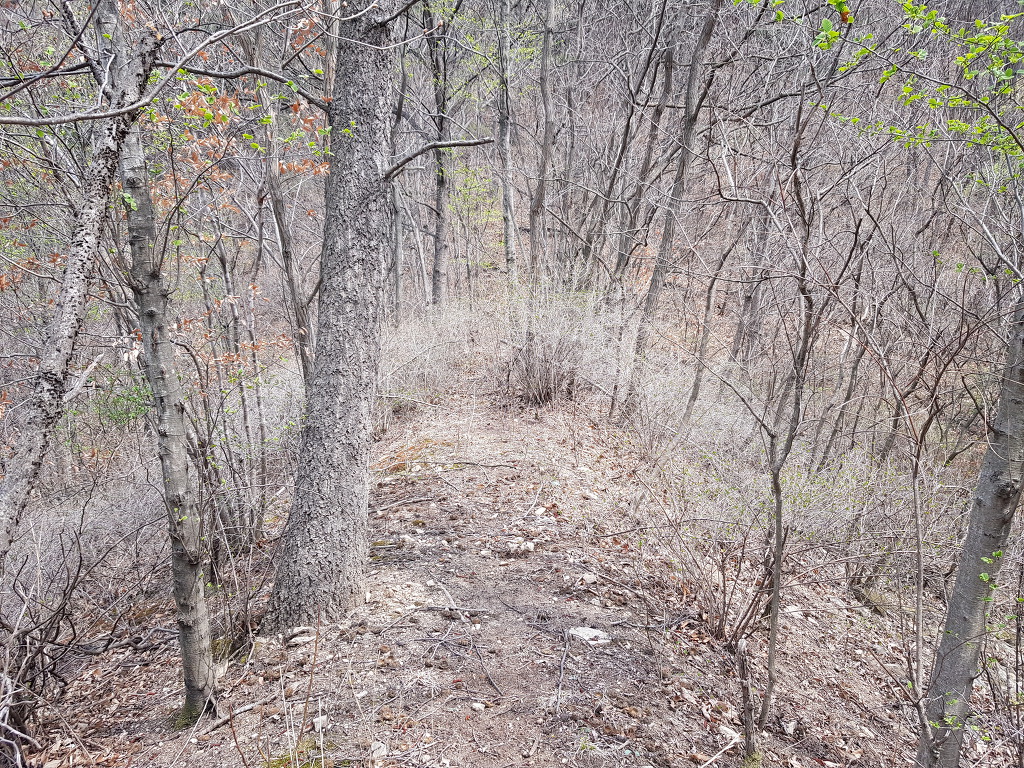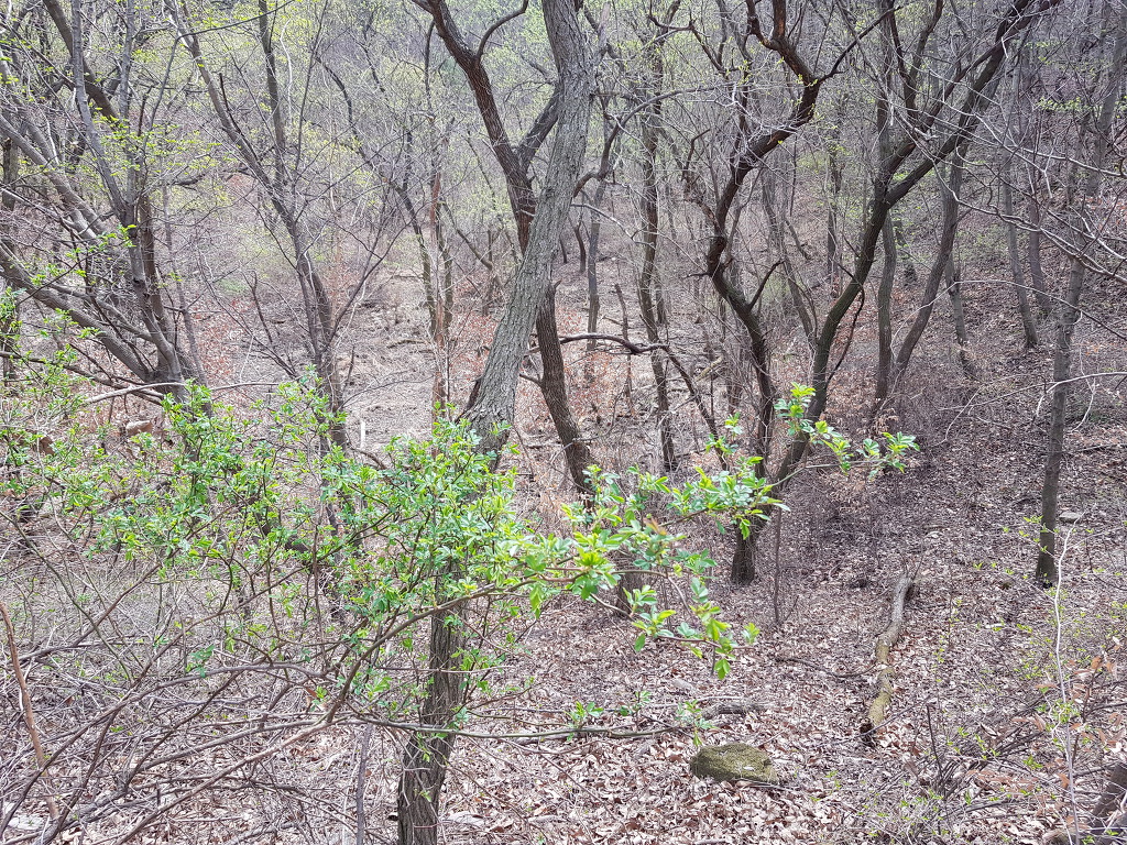 하산 길에, 국토진지 국사진지 확인 하려고, 등로에서 벗어나 없는 비탈길을 대충 치고 내려가, 지도에 표시된 위치에 가니,