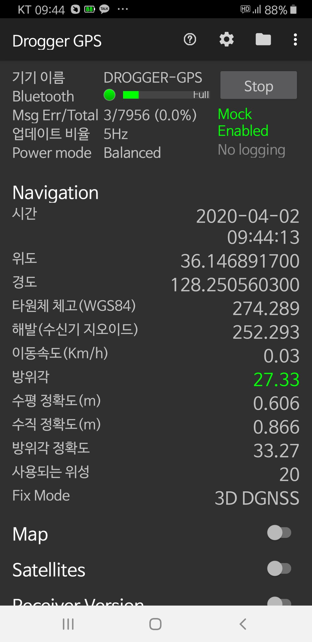 수신기 값은 조서와 거리는 2.1m, 높이는 1.1m 차이를 보입니다.