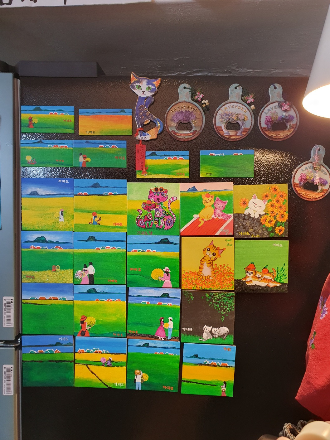 첫 사진은 수제공방에 들어가서 발견한 유화인데 자석 플라스틱의 한쪽을 벗겨내고 특수 안료로 그렸다고 합니다. 섬, 고래, 고양이 세가지가 주제인데 허락받고 그림카드 전체를 찍었어요. 공방사장분은 원래 화가셨는데 이제 연세가 있고 자녀는 육지로 떠나셔서 얼마나 더 할 수 있을까 생각하신다고. 나중에 향수 달랠 때 쳐다볼 생각으로 구입했습니다. ㅎㅎ