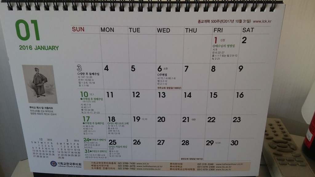 그리고 개신교회로서는 특이하게도(미국 개신교의 영향을 강하게 받은 한국 개신교의 맥락에서는 특히), 서방 그리스도교(로마 가톨릭과 성공회)의 전통적인 교회력에 따라 몇몇 성인들을 기념하고 있습니다. 가령 대한성공회에서 주요 축일로 지키는 8월 15일 성모안식축일의 경우, 한국 루터 교회 달력에서는 ‘주님의 어머니 마리아’가 표기되어 있는 식입니다. 다른 예를 들어보자면 1월 18일은 ‘사도 베드로의 고백’, 6월 24일은 ‘세례 요한의 탄생’으로 각각 표기되어 있습니다.