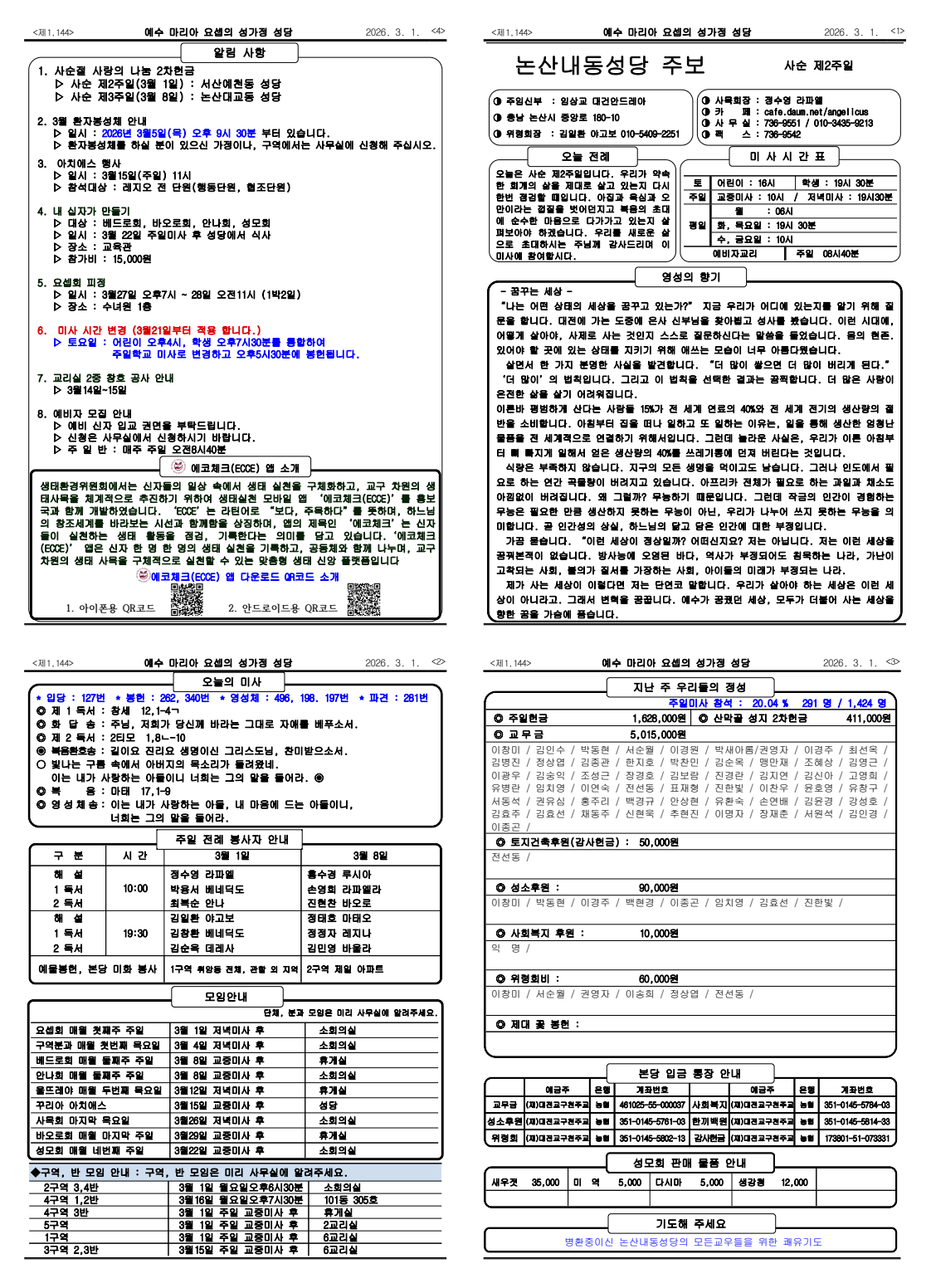 주보 2026 0301 사순 제2주일 제1144호 작성자Regina 75|작성시간26.02.28|조회수140 목록 댓글 0 글자크기 작게가 글자크기 크게가 다음검색 현재 게시글 추가 기능 열기 북마크 공유하기 신고 센터로 신고 댓글 댓글 0 댓글쓰기 답글쓰기 댓글 리스트
