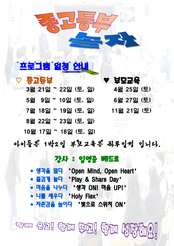 중고등부 놀자 일정 안내 작성자Regina 75|작성시간26.03.18|조회수43 목록 댓글 0 글자크기 작게가 글자크기 크게가 중고등부 놀자 웹자보.hwpx2.09MB 첨부파일첨부된 파일이 2개 있습니다. png 파일 image.png 다운로드 etc 파일 중고등부 놀자 웹자보.hwpx 다운로드 다음검색 현재 게시글 추가 기능 열기 북마크 공유하기 신고 센터로 신고 댓글 댓글 0 댓글쓰기 답글쓰기 댓글 리스트