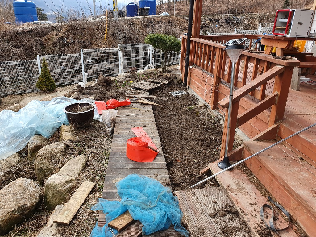 작성자분당농부/함영환/카페지기 작성자 본인 여부 작성자 작성시간 20.02.26 빗물받이에서 물이 내려와 튜립밭이 뻘이 되는 바람에 어제 개 고생하다가...황금사과 코치로 하수구 배수구를 사다가 세개를 땅에 심었읍니다...허리 빠지는줄 알앗읍니다...그래도 다행이 아직까지는 손,발이 움직이니...마눌님과 같이 열심히 땅파고 넣고 배수관 심고..해 놓았읍니다...튜립구근 반은 다시 뽑아서 갖고 있읍니다...내일쯤 땅이 마르면 다시 심어보아야지요...닭들이 마구 넘어와서 튜립뿌리를 반만 파먹고 해서 우리집 순이를 닭장앞으로 이동 배치했읍니다..나오기만 해봐라...이넘들.....으이구 허리야...