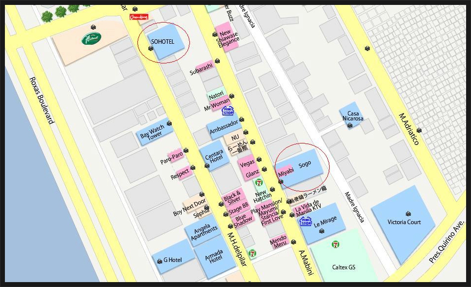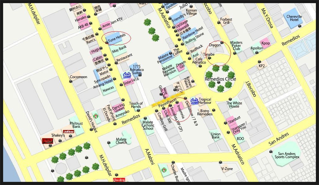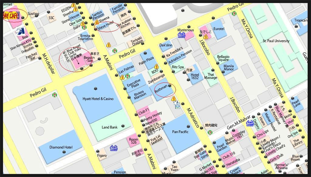 지도보는 방법은 하늘색은 호텔이며 분홍색은 술집, 노란 달러 표시자루가 환전소입니다