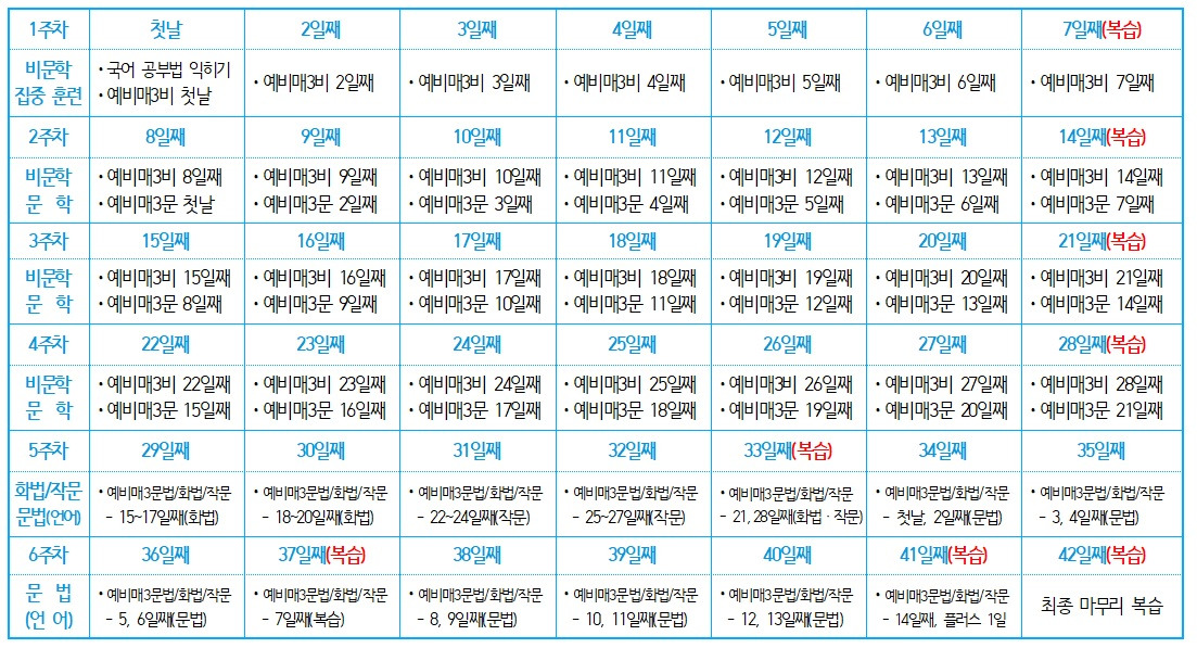 예비 고1을 위한, 고등 국어를 6주 만에 마스터하는 공부 계획표입니다.