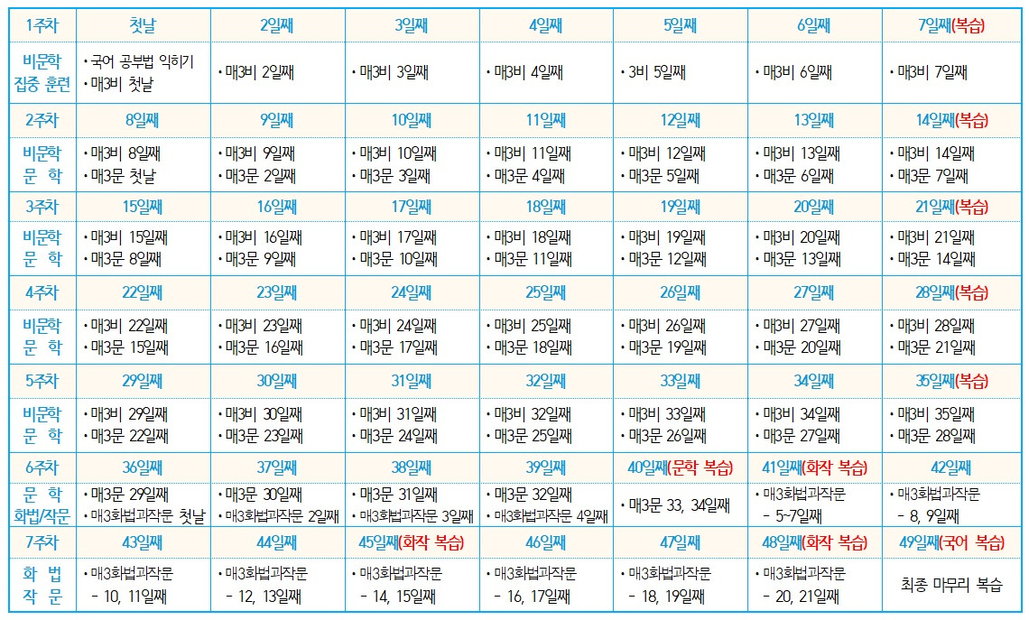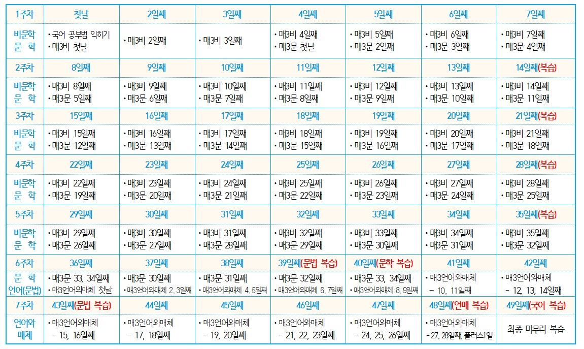 - 비문학은 되도록이면 아침 시간에 훈련하고, 복습은 공부한 날 하는 것이 좋습니다.