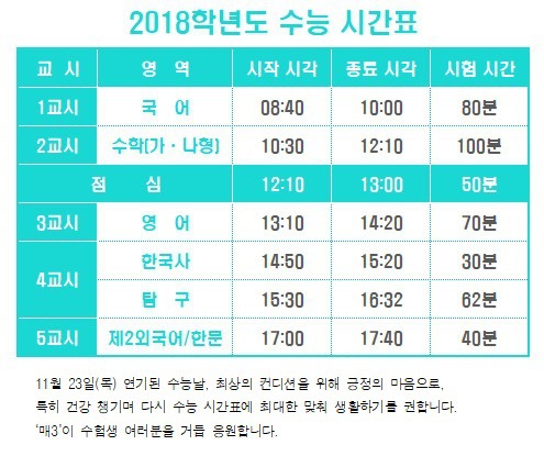 ▼ 아래' 2018학년도 수능 시간표'는 다운받아 실전 훈련 때 활용하세요.