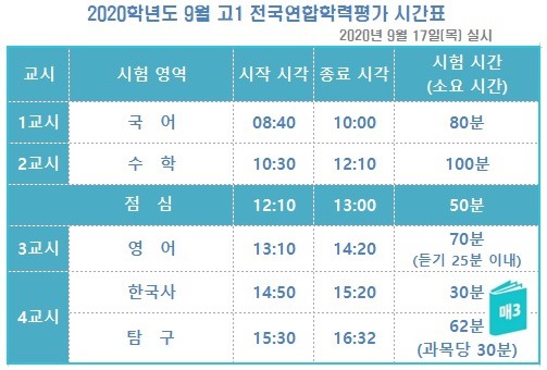 ▼ 2020학년도 9월 고1 전국연합학력평가 시간표