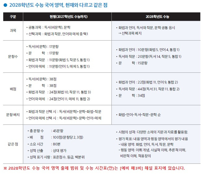 2028학년도 수능 체제(아래 표 참조)를 반영하여