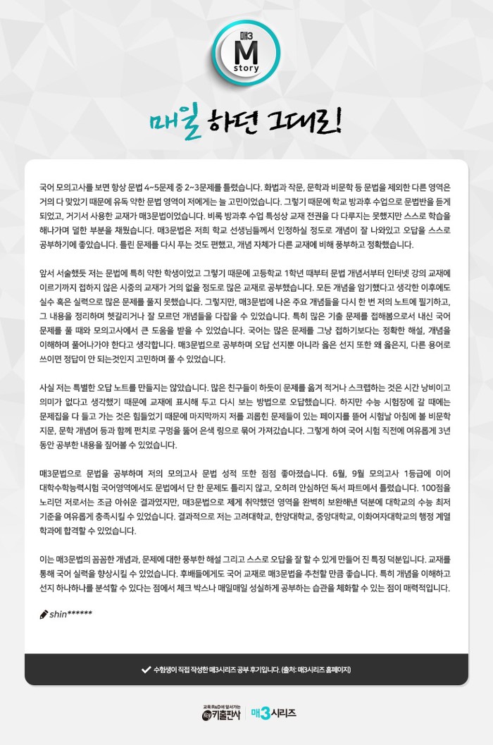 '매3문법'은 저희 학교 선생님들께서 인정하실 정도로 개념이 잘 나와 있고 오답을 스스로 공부하기에 좋았습니다. 틀린 문제를 다시 푸는 것도 편했고, 개념 자체가 다른 교재에 비해 풍부하고 정확했습니다. 저는 문법에 특히 약해서 고1 때부터 문법 개념서부터 인터넷 강의 교재에 이르기까지 접하지 않은 시중의 교재가 거의 없을 정도로 많은 교재로 공부했습니다. 하지만 모든 개념을 암기했다고 생각한 후에도 실수 혹은 실력의 부족으로 풀지 못하는 문제가 많았습니다. 그러다 '매3문법'에 나온 주요 개념들을 다시 한 번 노트에 필기하고, 그 내용을 정리하며 헷갈리거나 잘 모르던 개념들을 다잡을 수 있었습니다. 특히 많은 기출 문제를 접해봄으로써 내신 국어 문제를 풀 때나 모의고사를 볼 때 큰 도움을 받을 수 있었습니다.'
