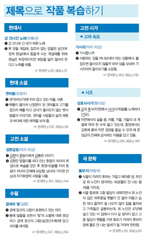 ※ 아래 이미지는 2024 매3문 해설에 제시된 '제목으로 작품 복습하기'에서 갈래별로 발췌한 것입니다.