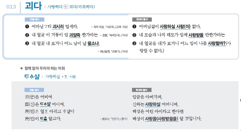 아래 이미지는 <매3어휘>에 있는 고전 시가 빈출 어휘 중 '괴다(사랑하다)에 관한 것입니다.