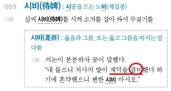 '시비(侍婢)'와 구분해서 알아야 하는 '시비(是非)' 예문에서 이해할 수 있습니다.