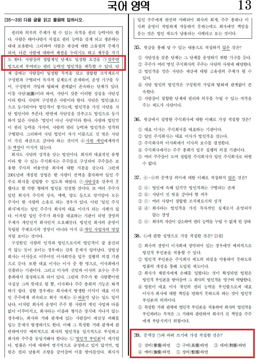 정답(구비)보다 오답(겸비)에 답한 학생들이 많았던 39번 어휘 문제를