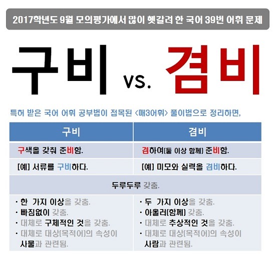 2017학년도 수능 대비 9월 고3 모의평가 국어 영역 39번 문제에서 헷갈려 한 '구비하다'와 '겸비하다'