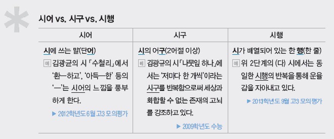시어와 시구, 시행의 의미 구분과 예시는 『매3어휘』 109쪽에서도 확인할 수 있다.