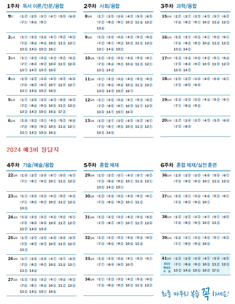 2024 매3비 정답지 작성자안인숙|작성시간23.04.22|조회수600 목록 댓글 0 글자크기 작게가 글자크기 크게가 2024 매3비 정답은 아래와 같습니다. 참고로, 스마트폰으로 본문 표지에 있는 QR 코드를 찍으면 ‘매3’에서 강조하는 ‘제대로 채점법’이 적용된 ‘매3국어 자동 채점 프로그램’으로 이동합니다. 다음검색 현재 게시글 추가 기능 열기 북마크 공유하기 신고 센터로 신고 댓글 댓글 0 댓글쓰기 답글쓰기 댓글 리스트