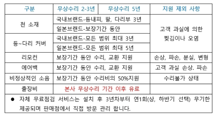 예로 무상수리 지원이 안되는 소모품(리모컨, 에어백, 커버, 천소재등)과 비정상 적인 소음에 대한