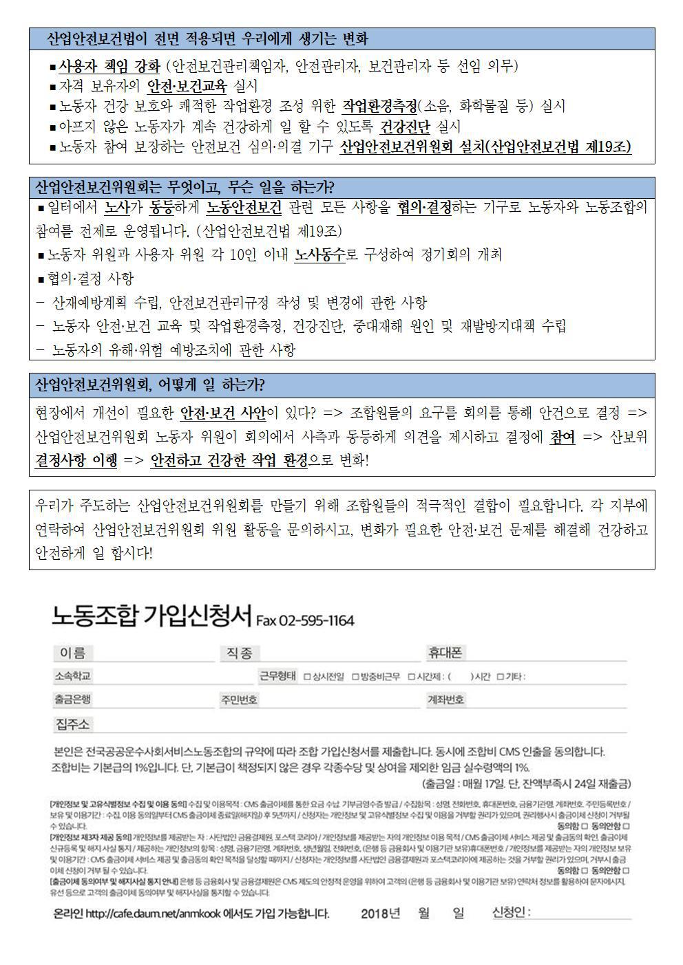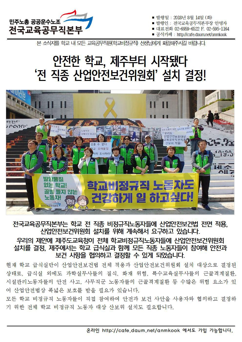 [노동안전]전직종 산업안전보건위원회 설치, 제주도에서 시작! 작성자전국교육공무직본부|작성시간18.08.14|조회수264 목록 댓글 0 글자크기 작게가 글자크기 크게가 180814_소식지 산보위_180814.hwp 첨부파일첨부된 파일이 3개 있습니다. jpg 파일 180814_소식지 산보위rev001.jpg 다운로드 jpg 파일 180814_소식지 산보위rev002.jpg 다운로드 hwp 파일 180814_소식지 산보위_180814.hwp 다운로드 다음검색 현재 게시글 추가 기능 열기 북마크 신고 센터로 신고 댓글 댓글 0 댓글쓰기 답글쓰기 댓글 리스트