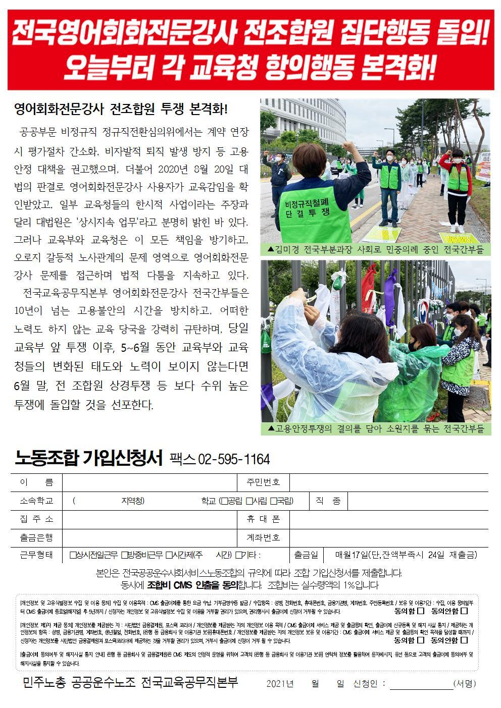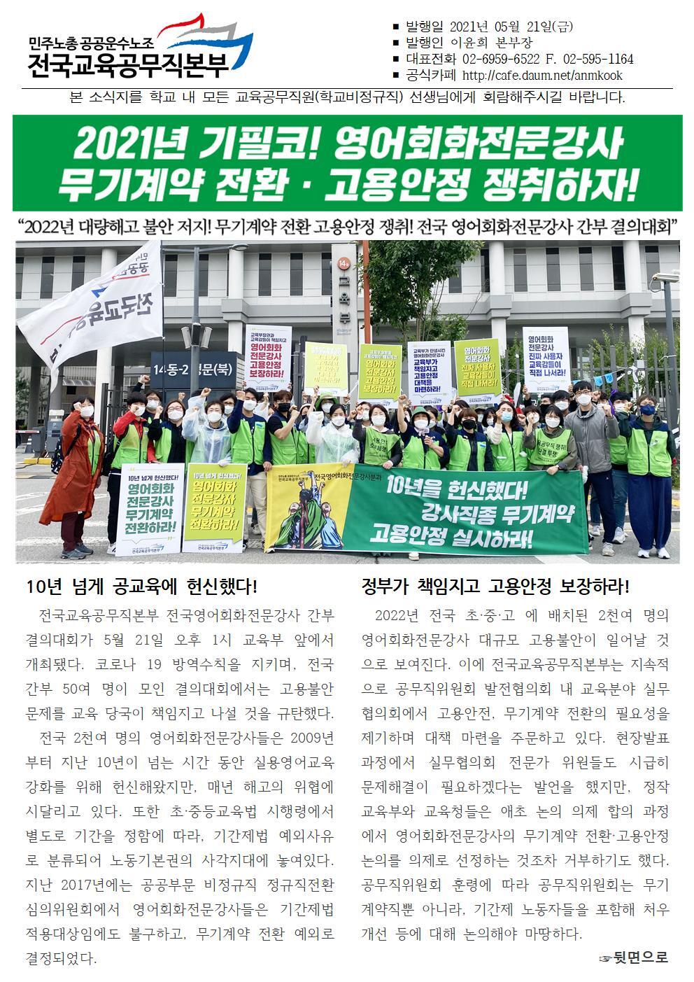 2021년 기필코! 영어회화 전문강사 무기계약 전환·고용안정 쟁취하자! 전국 영어회화전문강사 간부결의대회 개최! 작성자전국교육공무직본부|작성시간21.05.21|조회수881 목록 댓글 0 글자크기 작게가 글자크기 크게가 [소식지]20210521_전국영어회화전문강사분과 간부결의대회.hwp10.52MB 첨부파일첨부된 파일이 3개 있습니다. jpg 파일 20210521_전국영어회화전문강사분과 간부결의대회001.jpg 다운로드 jpg 파일 20210521_전국영어회화전문강사분과 간부결의대회002.jpg 다운로드 hwp 파일 [소식지]20210521_전국영어회화전문강사분과 간부결의대회.hwp 다운로드 다음검색 현재 게시글 추가 기능 열기 북마크 신고 센터로 신고 댓글 댓글 0 댓글쓰기 답글쓰기 댓글 리스트