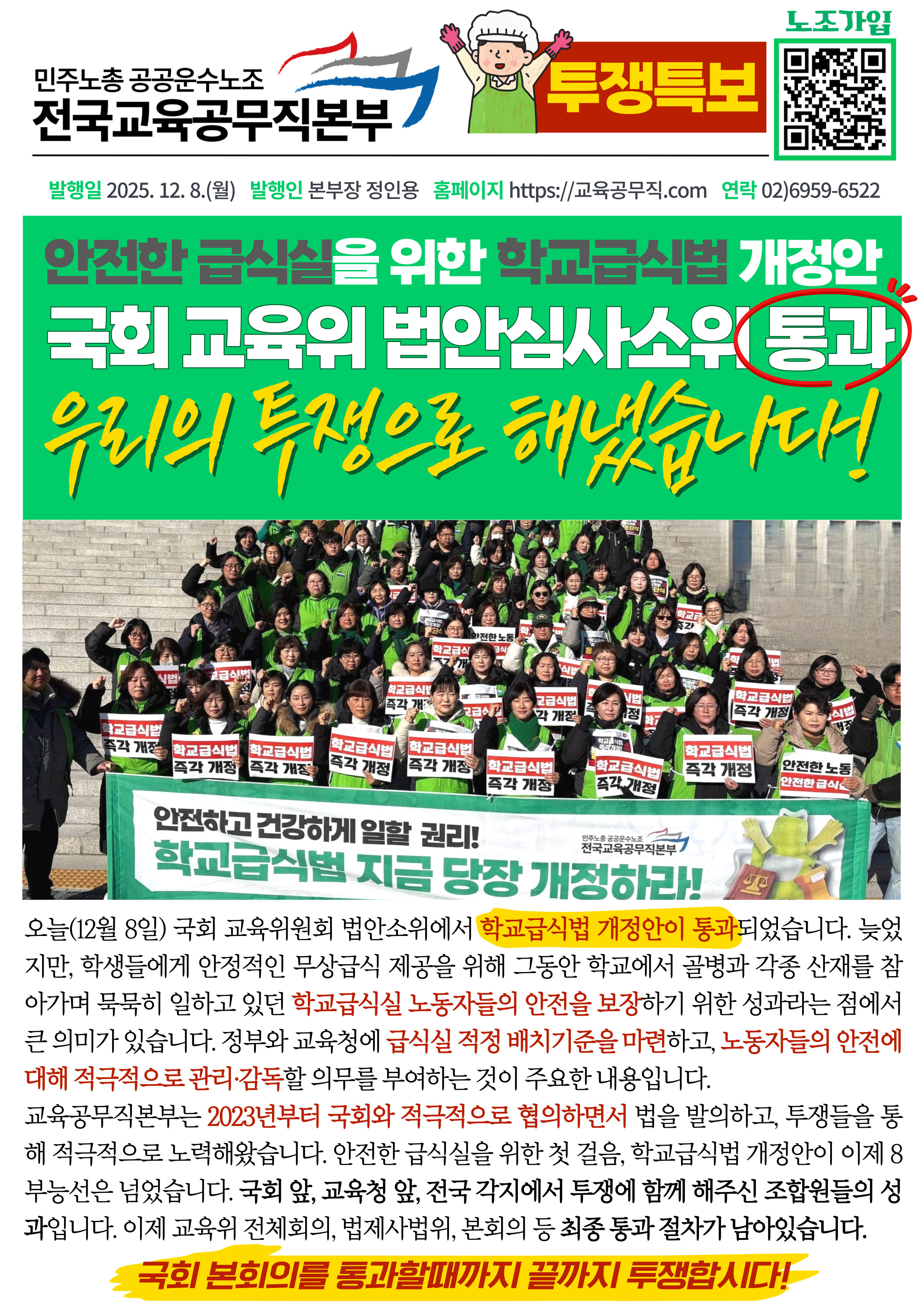 [투쟁특보]국회 교육위 법안심사소위 통과 우리의 투쟁으로 해냈습니다! 작성자전국교육공무직본부|작성시간25.12.08|조회수5,330 목록 댓글 3 글자크기 작게가 글자크기 크게가 다음검색 현재 게시글 추가 기능 열기 북마크 신고 센터로 신고 댓글 댓글 3 댓글쓰기 답글쓰기 댓글 리스트 작성자오재옥(경기교육공무직) | 작성시간 25.12.09 고생많으셨습니다 답댓글 작성자전국교육공무직본부 작성자 본인 여부 작성자 | 작성시간 25.12.09 조합원 여러분의 참여로 가능했습니다. 수고 많으셨습니다. 투쟁! 작성자동화신화맘(경기서촌초_과학) | 작성시간 25.12.09 그간 고생 많으셨습니다. 역시 👍학교급식법 개정안 통과에 무한 박수를 보냅니다. 감사합니다. 댓글 전체보기