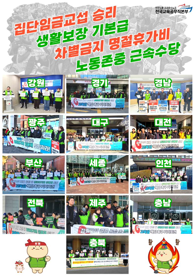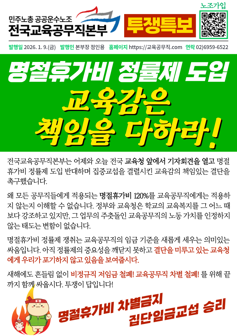 [투쟁소식]명절휴가비 정률제 도입, 교육감은 책임을 다하라! 작성자전국교육공무직본부|작성시간26.01.09|조회수3,383 목록 댓글 0 글자크기 작게가 글자크기 크게가 다음검색 현재 게시글 추가 기능 열기 북마크 신고 센터로 신고 댓글 댓글 0 댓글쓰기 답글쓰기 댓글 리스트