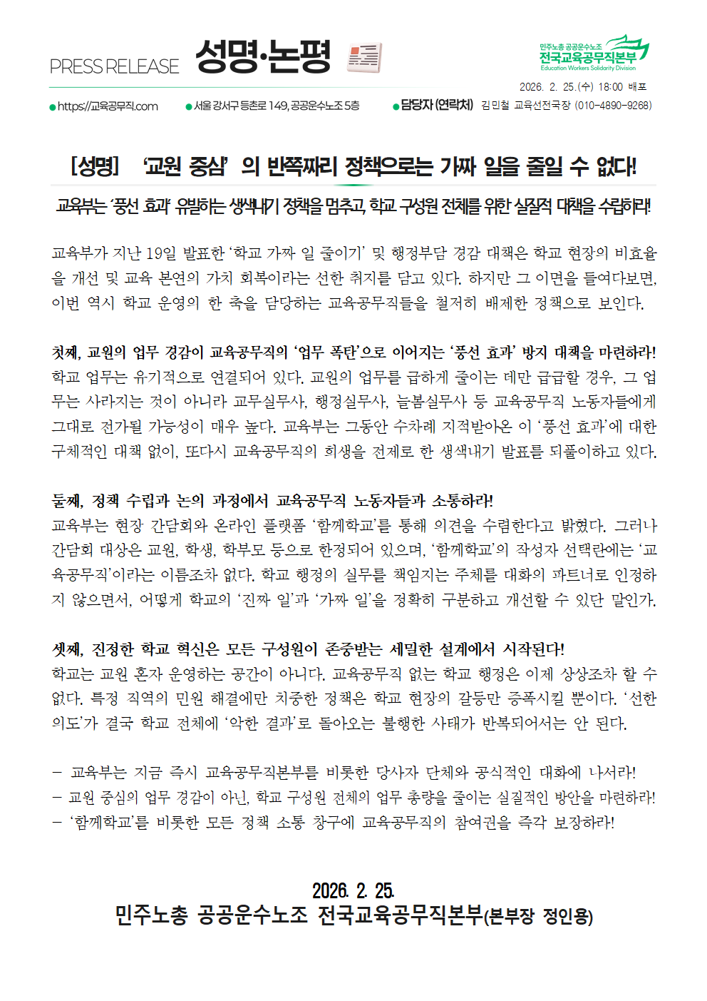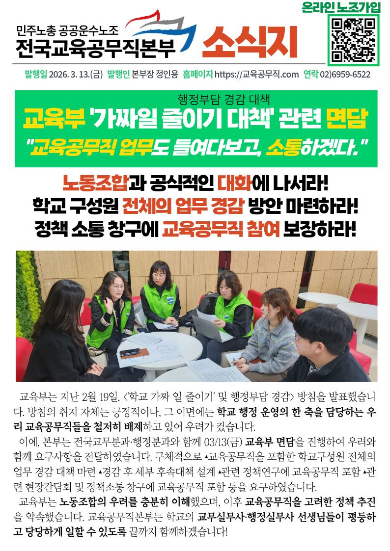 [교육부 면담 소식지] 행정부담 경감 대책, 학교구성원 전체에게 적용하라! 작성자전국교육공무직본부|작성시간26.03.13|조회수515 목록 댓글 0 글자크기 작게가 글자크기 크게가 다음검색 현재 게시글 추가 기능 열기 북마크 신고 센터로 신고 댓글 댓글 0 댓글쓰기 답글쓰기 댓글 리스트