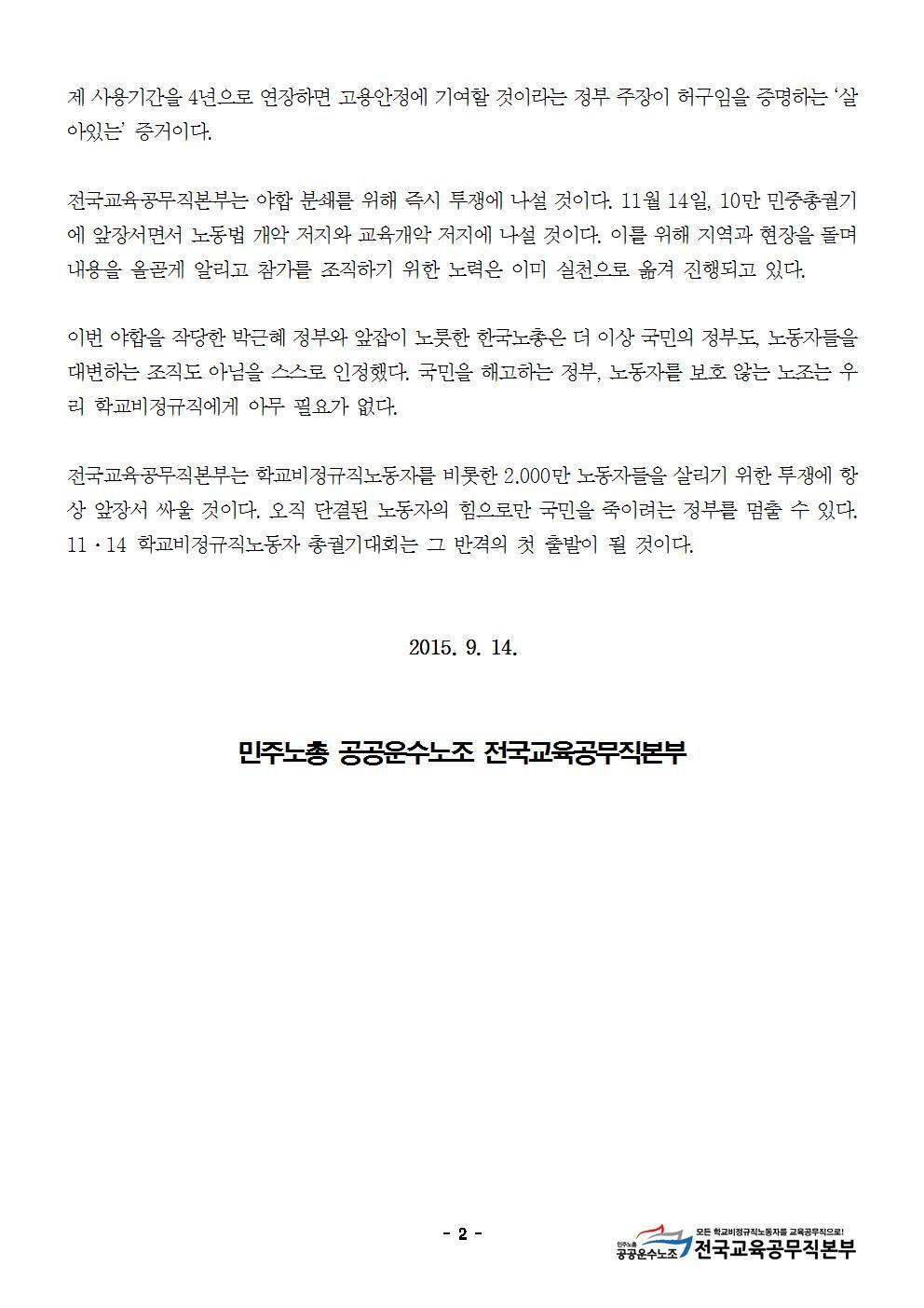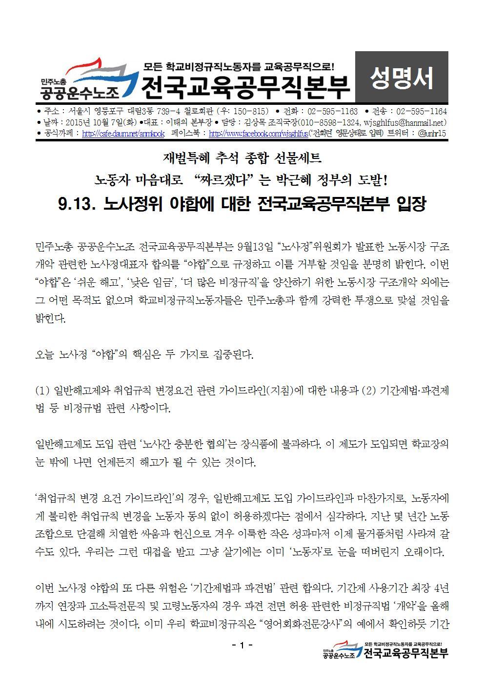 [성명서] 9.13. 노사정위 야합에 대한 전국교육공무직본부 입장 작성자전국교육공무직본부|작성시간15.09.14|조회수140 목록 댓글 0 글자크기 작게가 글자크기 크게가 [성명서] 9.13 노사정위 야합에 대한 전국교육공무직본부 입장.hwp 첨부파일첨부된 파일이 3개 있습니다. jpg 파일 [성명서] 9.13 노사정위 야합에 대한 전국교육공무직본부 입장001.jpg 다운로드 jpg 파일 [성명서] 9.13 노사정위 야합에 대한 전국교육공무직본부 입장002.jpg 다운로드 hwp 파일 [성명서] 9.13 노사정위 야합에 대한 전국교육공무직본부 입장.hwp 다운로드 다음검색 현재 게시글 추가 기능 열기 북마크 신고 센터로 신고 댓글 댓글 0 댓글쓰기 답글쓰기 댓글 리스트