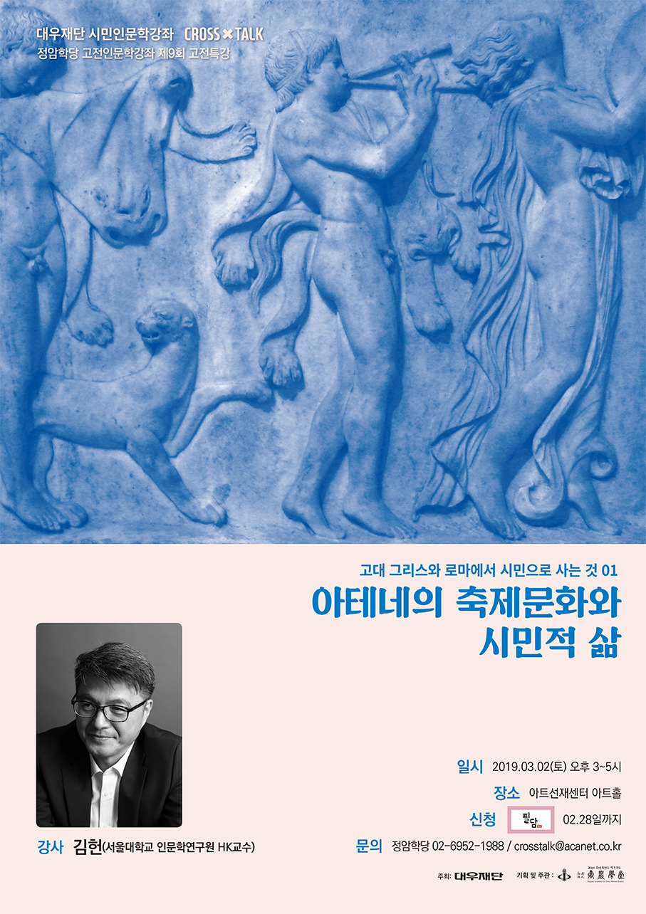 〈그리스와 로마에서 시민으로 사는 것〉이라는 주제로, 총 8회에 걸쳐 진행되는 2019년 정암학당 고전특강의 첫 번째 강좌는 ‘아테네의 축제문화와 시민적 삶’입니다. 서양의 국가와 도시, 국민과 시민의 원형을 이루는 것은 고대 그리스와 로마의 공동체와 그 안의 사람들, 그리고 그 삶이라고 할 수 있습니다. 권력자와 권력집단이 임의로 설정한 국가의 이념과 그에 복속된 예속민의 삶이 아니라, 자유로운 주체들의 충돌과 결단, 합의의 산물인 그리스와 로마의 시민적 삶은 언제나처럼 또 다시 시민적 삶에 대해 고민해야 하는 오늘의 우리에게, 역시 언제나처럼 신선한 통찰을 안겨 주리라고 생각합니다. 그래서 고전인문학강좌는 총 8회에 걸쳐 고대 그리스와 로마의 시민적 삶을 형성한 여러 요소들을 통해 그들이 시민으로서의 삶을 어떻게 구축하고 영위했는지 살펴보고자 합니다.