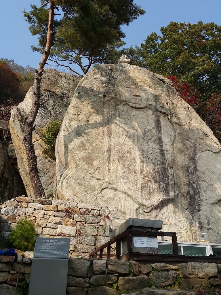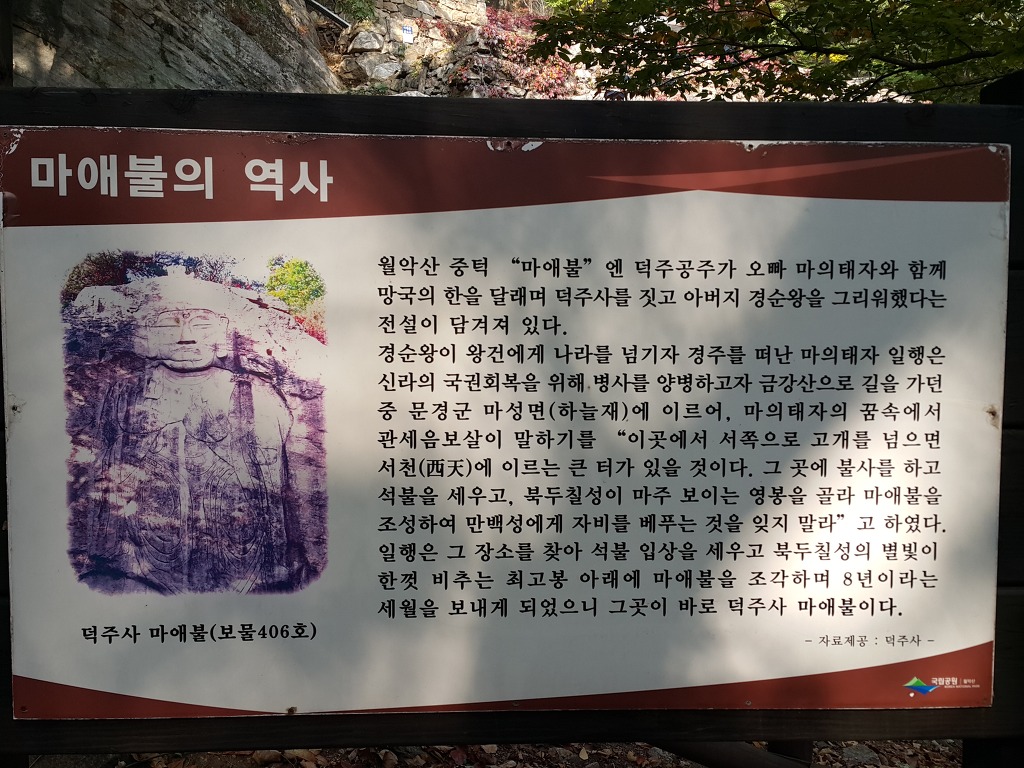 덕주사 담사를 마치고 보물 제406호. ' 동국여지승람 ' 에 의하면 덕주사는 마의태자의 누이 덕주공주가 건립한 절이라고 하는데, 한국 전쟁때 불타버리고 지금은 절터만 남아 있다.마애불은 남쪽 화강암벽면 가득히 부조되었는데 얼굴과 어깨는 도드라지게 조각되었고 그 아래는 선각으로 간략하게 처리되었다. 이제 그 마애여래입상을 보러 정상쪽으로 산행을 시작 하였다. 거리는 약 왕복 3km인데 보기 보다는 무지 멀게 느껴 졌다.