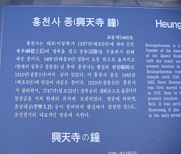 1462년(세조 8) 7월 조선 태조의 후비(后妃) 신덕왕후(神德王后)의 원찰이었던 흥천사용으로 제작된 조선시대의 종.